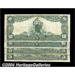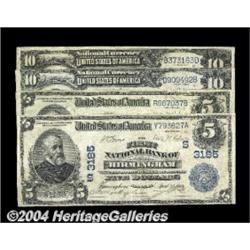 Four Different FNB of Birmingham Third Charter Nationals.Birmingham, AL - $5 1902 Date Back Fr. 590 The First NB Ch. #(S) 3185 VFBirmingham, AL - $5 1902 Plain Back Fr. 598 The First NB Ch. #(S) 3185 Fine, internal tearBirmingham, AL - $10 1902 Date Back Fr. 616 The First NB Ch. #(S) 3185 VF+Birmingham, AL - $10 1902 Plain Back Fr. 616 The First NB Ch. #(S) 3185 VF, tear. 4 notes <BR><BR><B>Important notice:</B> Heritage usually auctions material at the rate of 200-250 lots per hour. On some occasions eBay Live bid software or the Internet may not be able to keep up with the pace of the auction. We recommend placing a realistic absentee bid now as insurance to avoid disappointment. Occasionally the auctioneer may eliminate or reject an eBay Live bid, and the auctioneer may also reopen a lot after the close of the eBay live bidding (usually because we missed an audience bid), and may reject your bid even if it shows you as the winning bidder. By bidding via eBay Live, you agree that Heritage may award the lot to another bidder at its sole discretion under the circumstances described above or any other reasonable circumstances. Since eBay bids are not shown to us until we open the lot on the floor, we treat those bids just like floor bids. In most cases the floor responds before the eBay bid is presented to us, due to Internet lag time, so for consistency we have made it a policy that floor bids are always considered first over tie eBay live bids. Also please note that all Heritage lots purchased through eBay Live carry a 20% Buyer's Premium. Please make sure you read the Terms and Conditions before you bid. <BR><BR><B>IMPORTANT ANNOUNCEMENT ABOUT RESERVES:</B> Heritage now divulges all reserves on its web site 7 days before every auction. If you want to know whether the reserve on this lot has been met, and if not, what the reserve amount is, please visit this lot page on the HeritageCoin.com web site, or email: bid@HeritageGalleries.com