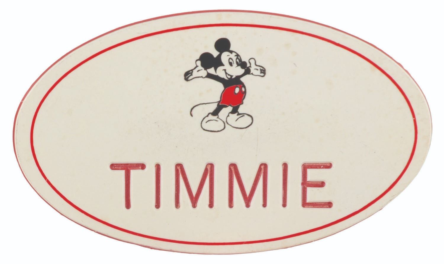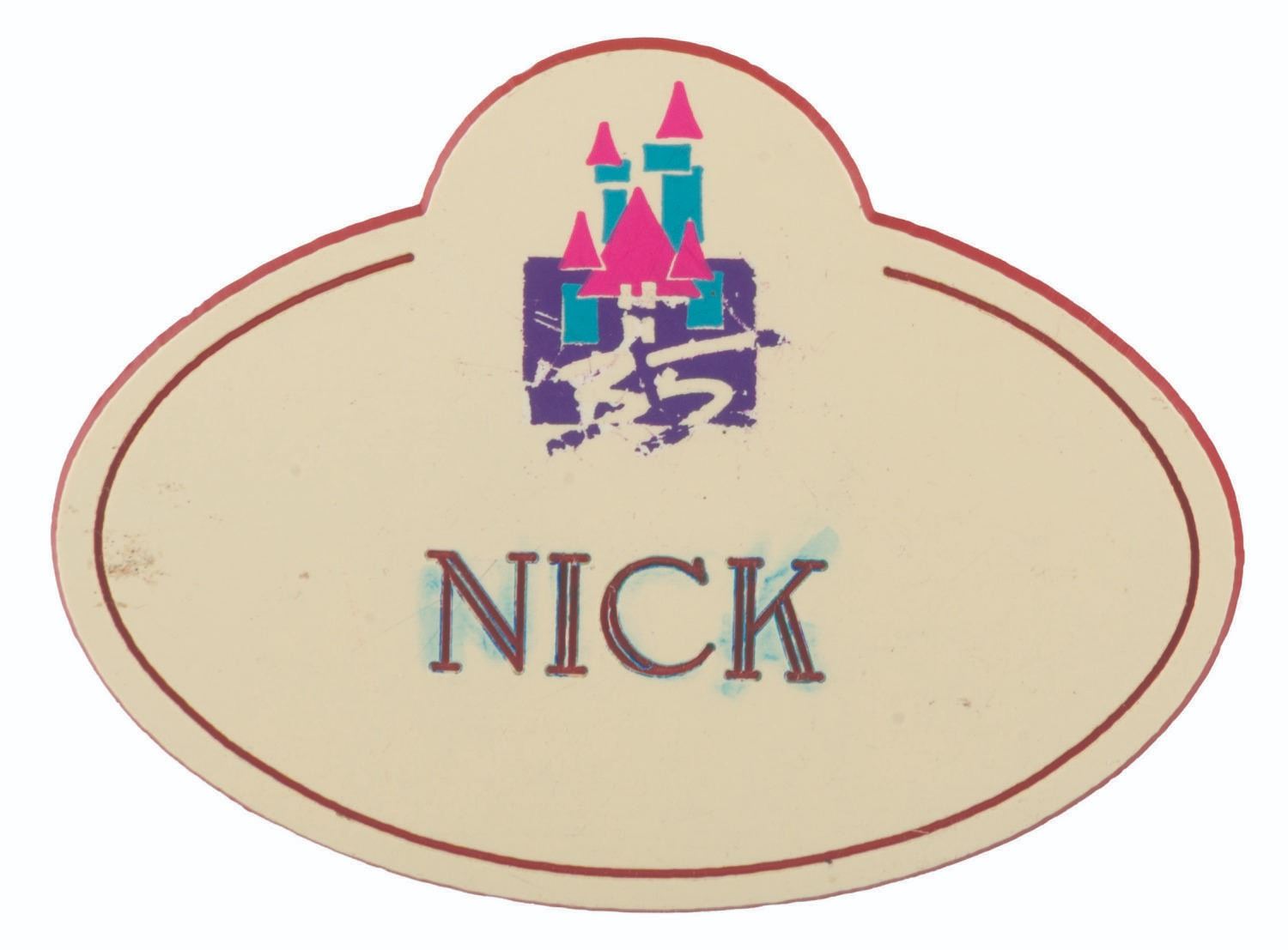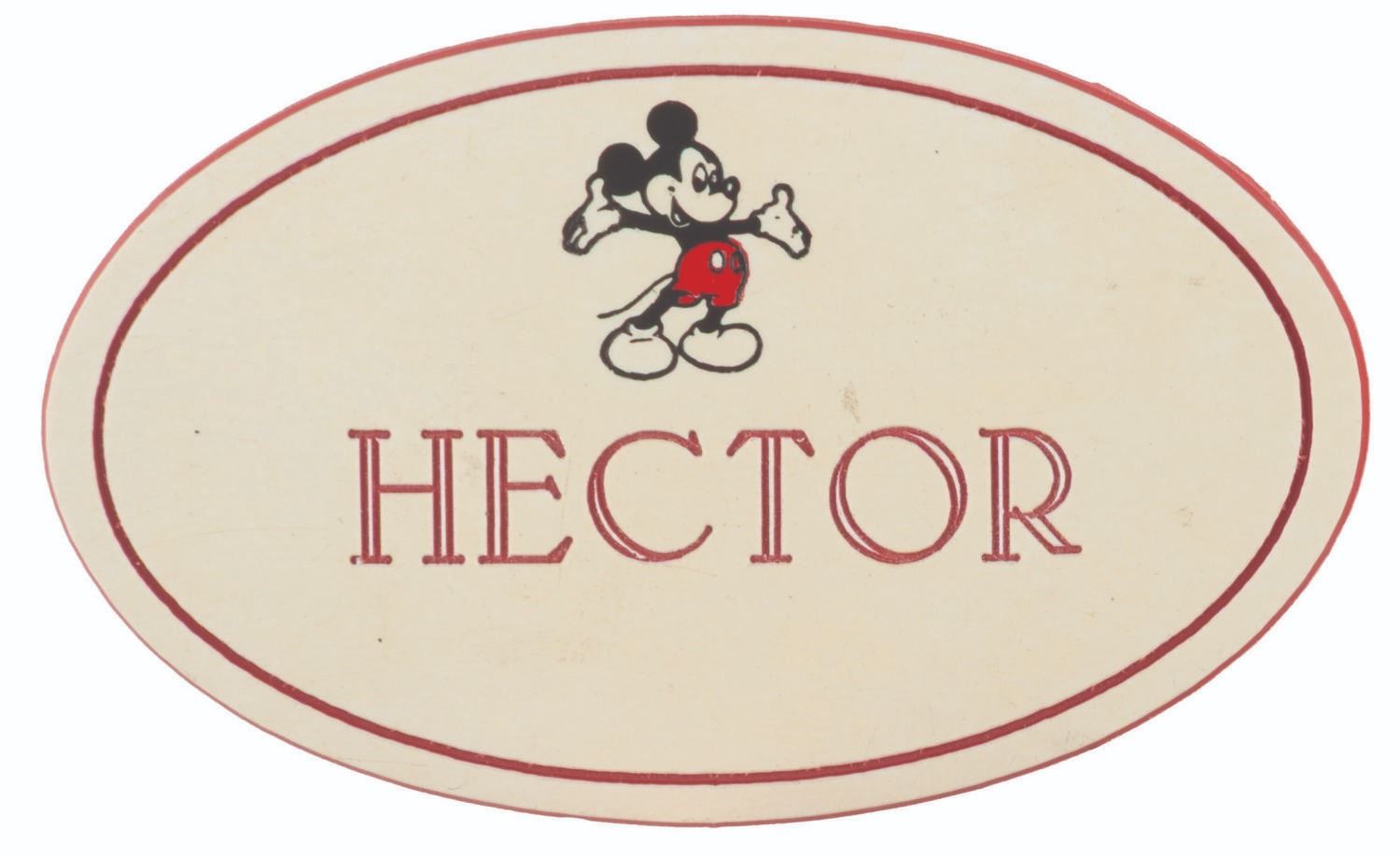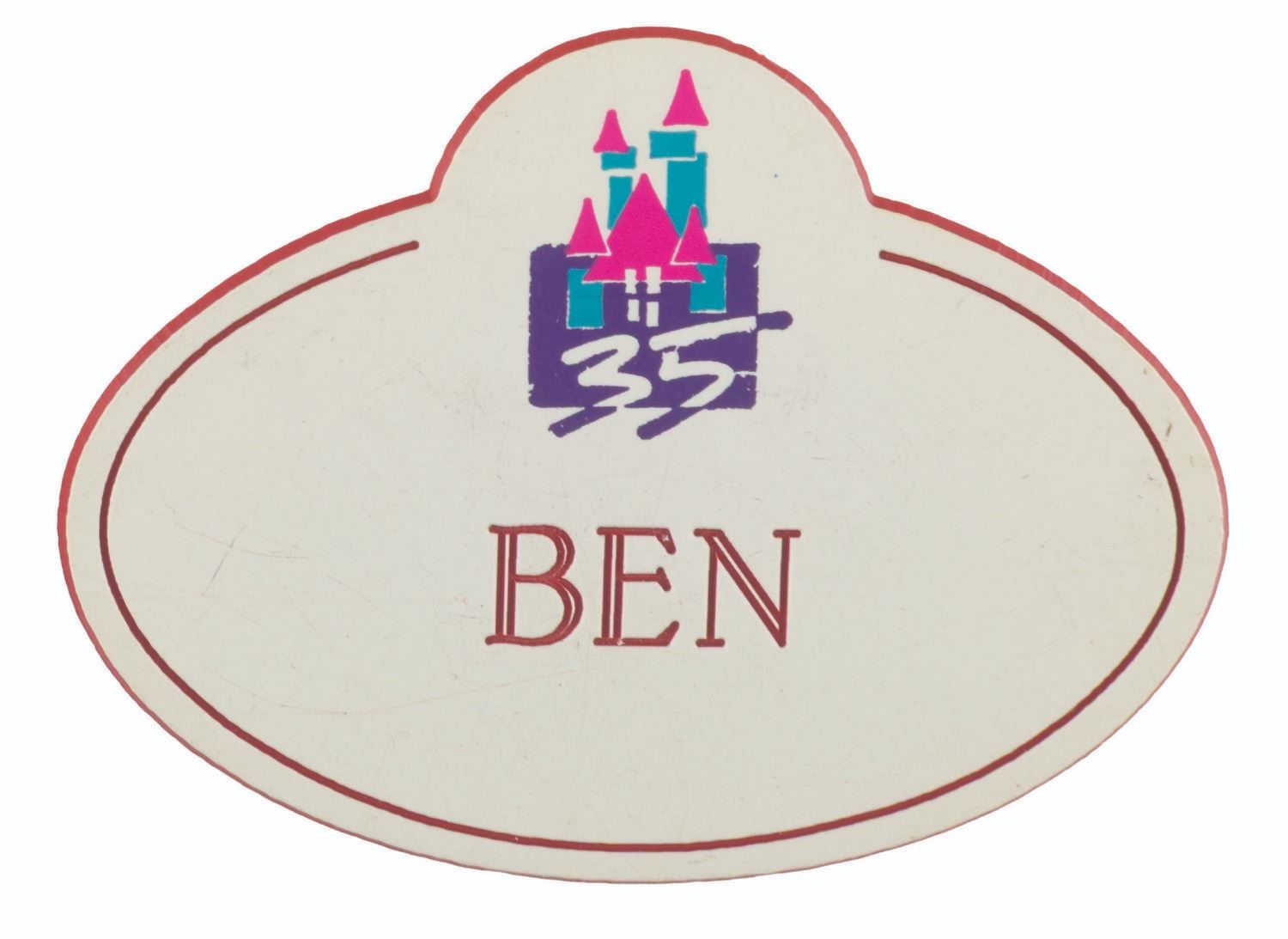 (Disneyland, 1980s-90s) A collection of four Disneyland Cast Member name badges. Included are regular Mickey badges for Timmie and Hector, and 35th Anniversary logo badges for Ben and Nick. The badges are in very good condition with light wear from use, and some faint color marker on the Nick badge.