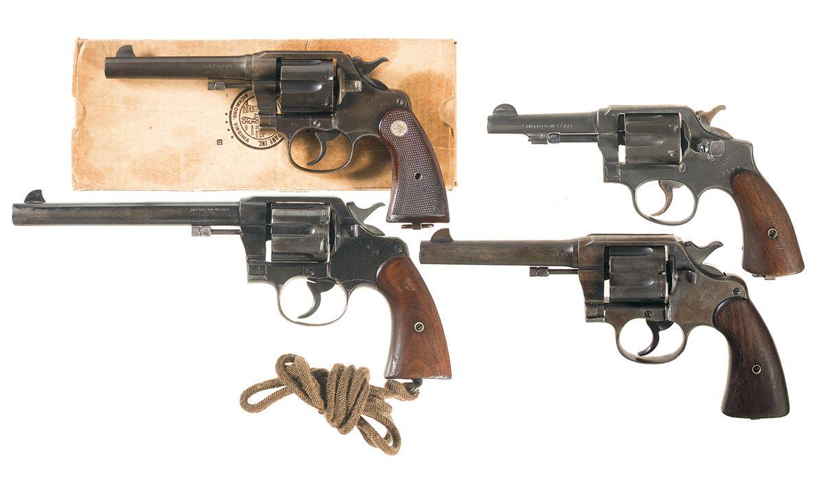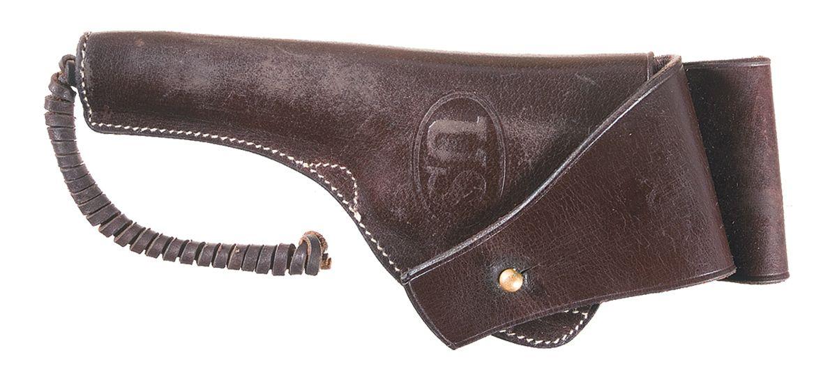 A) Manufactured in 1917 with standard markings and features and "AA" arsenal rework marks. Complete with brown leather "U.S." holster and box.