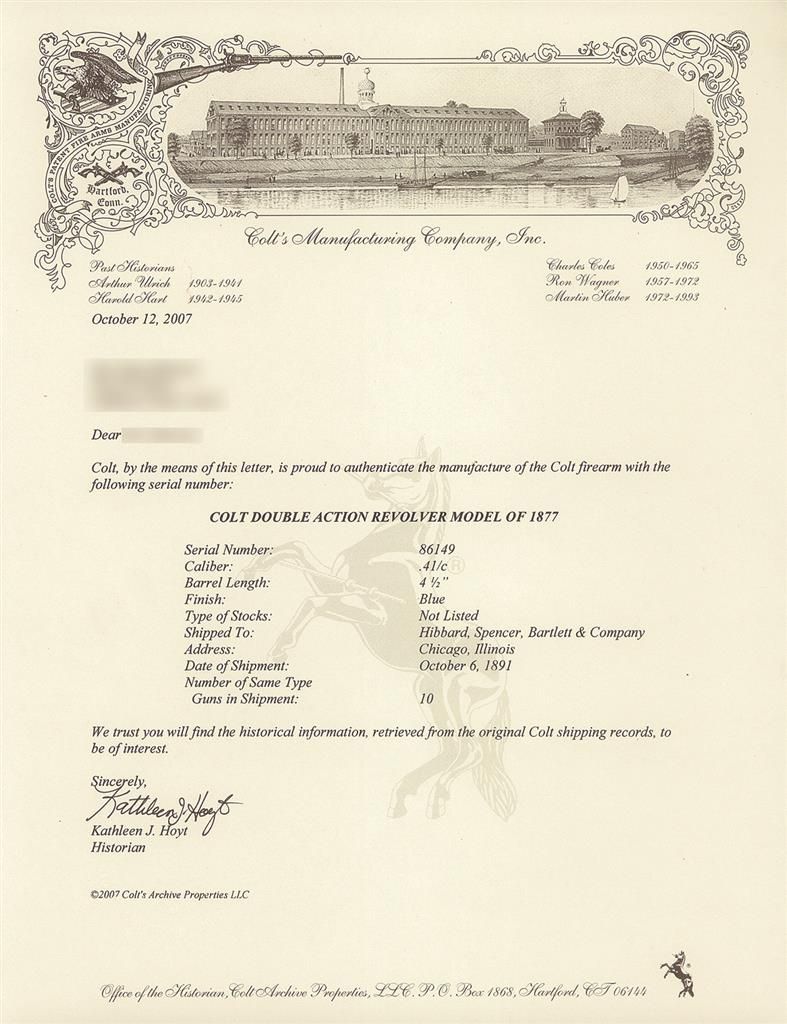 B) Action needs work. Factory letter verifies the caliber, barrel length, blue finish with grips as "Not Listed" and that it was shipped as 1 of 10 to Hibbard, spencer, Bartlett & company in Chicago, Illinois on October 6, 1891.