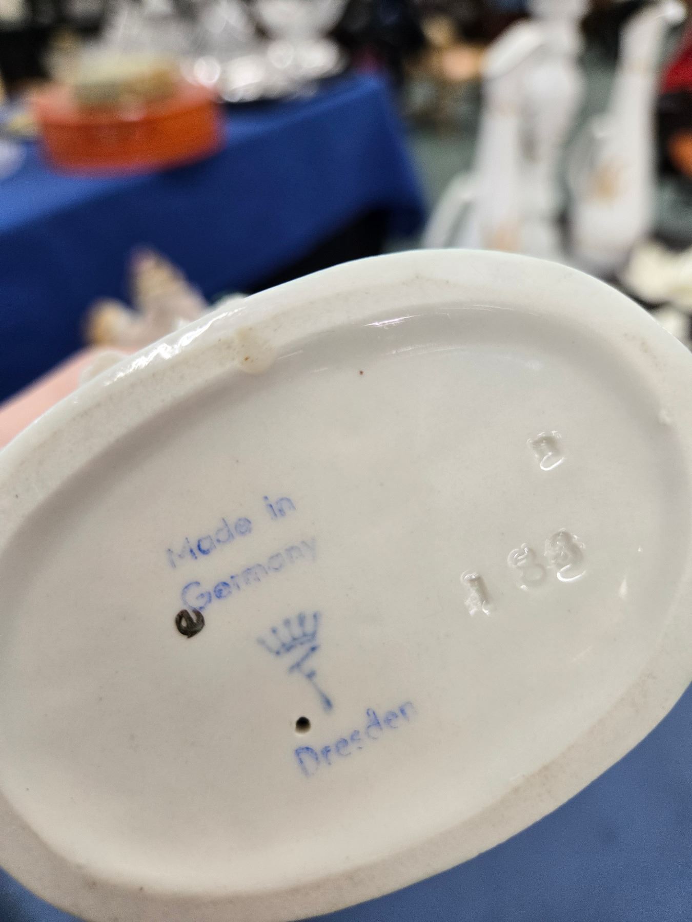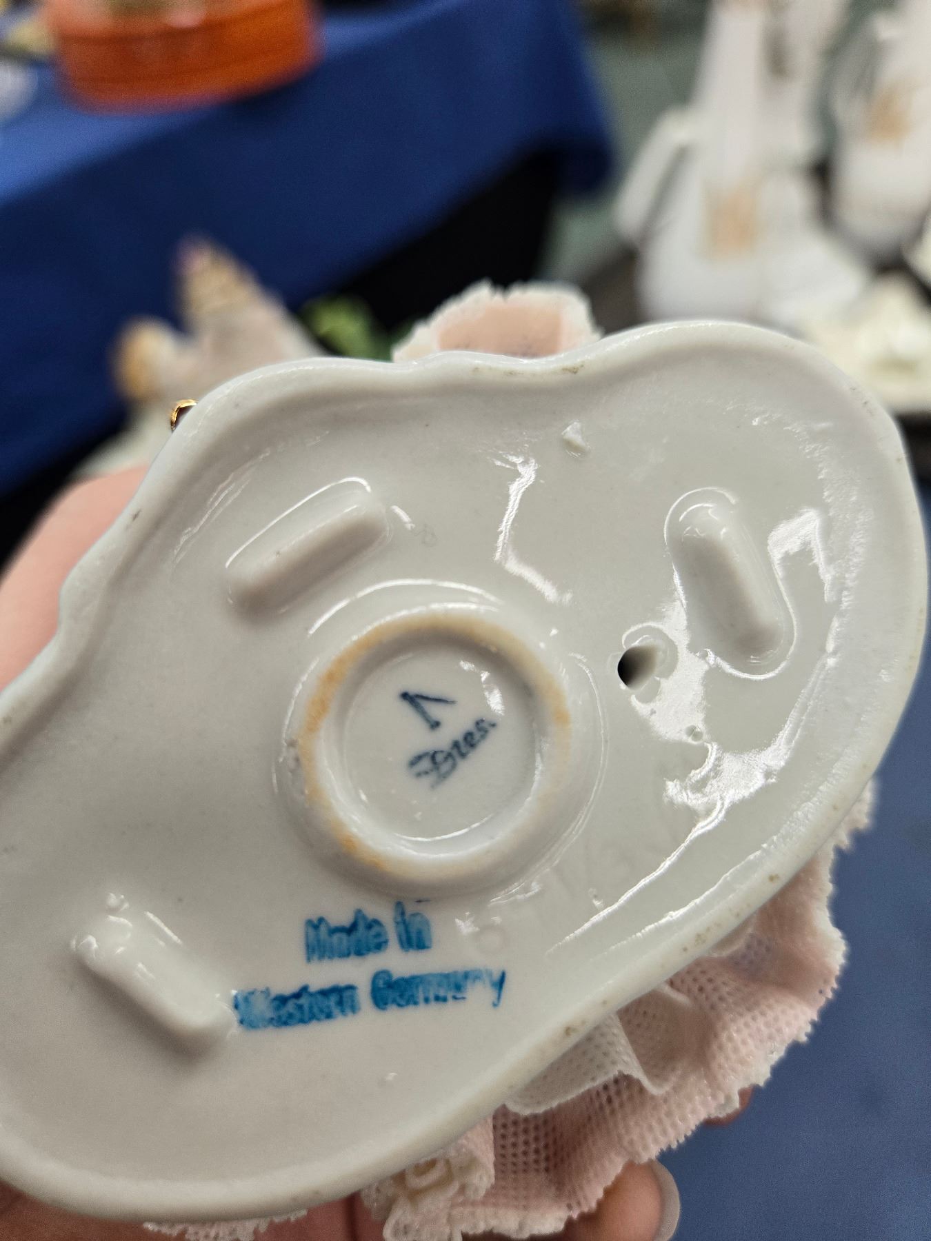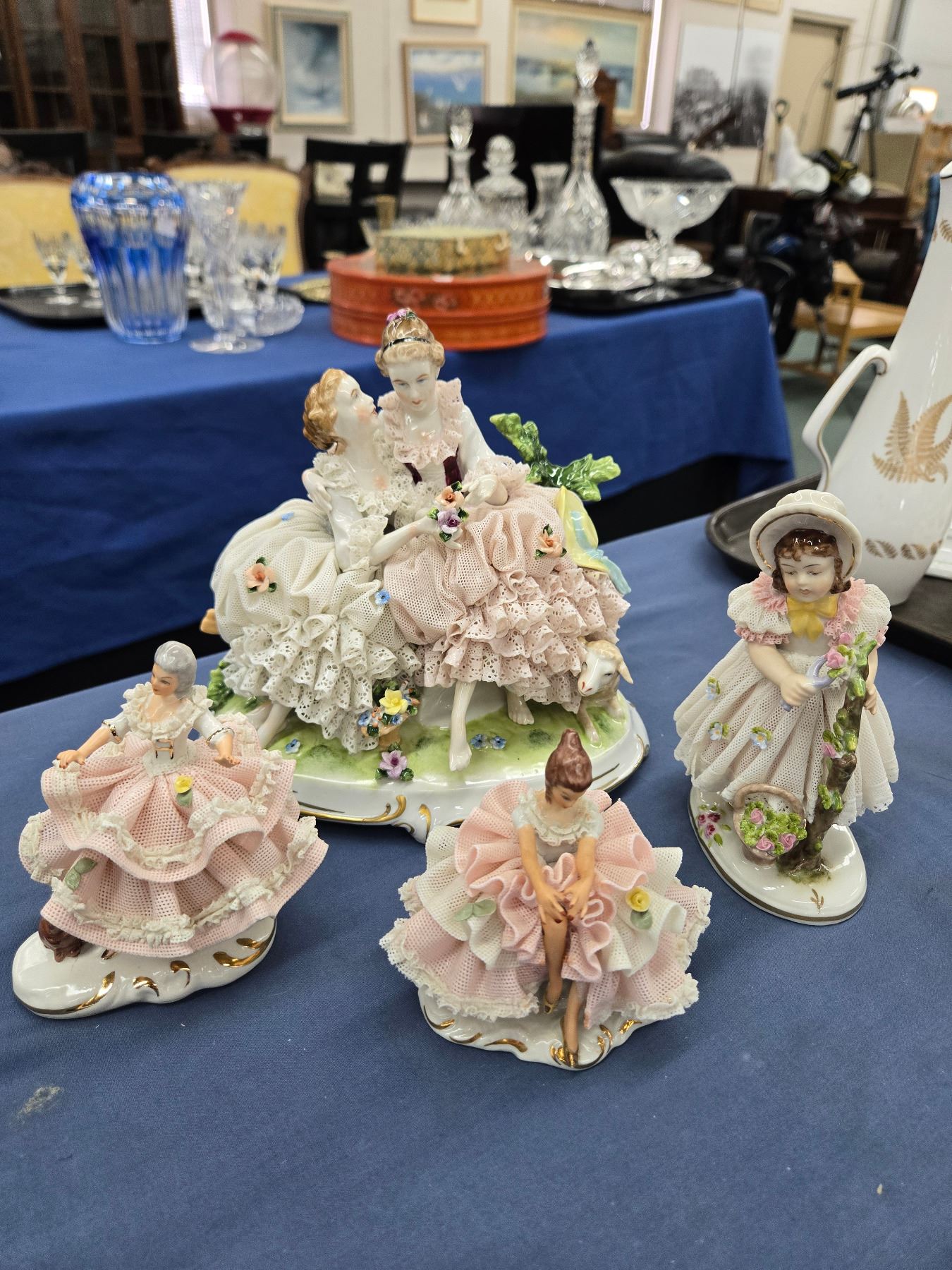 Four Dresden figurines including dancers, pair of ladies on a bench etc. ranging from 3 1/2" to 7" i