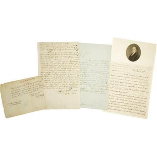 <B>Four Early Letters With Pennsylvania Content.</B></I> Includes a <B>Fisher Ames</B></I> autograph letter signed “<I>Fisher Ames</B></I>”, four page, 8” x 9.75”, Philadelphia, May 20, 1798, mounted to a larger backing sheet with a portrait of Ames, mounting remnants present, with the usual fold creases, else near fine; <B>James Dumers </B></I>autograph letter signed “<I>Jas. Dumers</B></I>”, one page, 8” x 6.75”, Reading PA , April 13, 1802, to Samuel Bryan, Comptroller General, toned with splits in the folds, else good condition; <B>Joseph Habersham</B></I> autograph letter signed “<I>Jos. Habersham</B></I>”, one page, 8” x 12.75”, Philadelphia, February 17, 1796, to Charles Williamson, with the usual fold creases, else fine; and an <B>Isaac Weaver</B></I> autograph document with autograph letter on the integral leaf signed “<I>Isaac Weaver Speaker of the Senate</B></I>” and “<I>Isaac Weaver</B></I>”, 8” x 13.25”, Jefferson Greene County PA , August 7, 1817, to Nicholas Biddle, mounting remnants along the left margin, with the usual fold creases, else fine condition. <I>From the collection of Henry E. Luhrs.</B></I><BR><BR><b>Shipping:</b> Flat Material, Small (<a target="_blank" href="http://www.heritageauctions.com/common/shipping.php">view shipping information</a>)