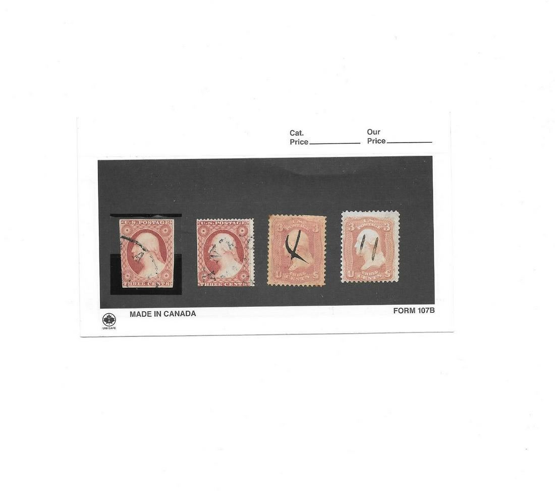 Four Early Washington 3 Cent Stamps. This offering includes a 1861 SC#11, #25, a superb #26 and a wonderful #65.
