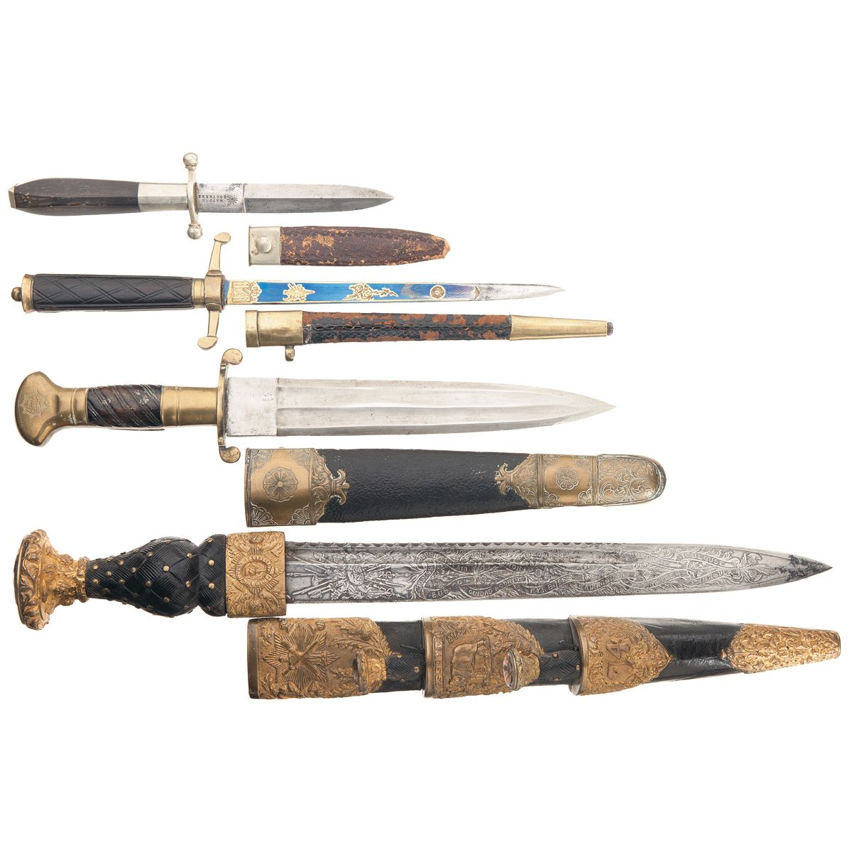 Dagger, 8 1/4" blade, brass hardware, appears to be Farsi markings on pommel, leather bound sheath. Dagger, 7 1/4" blue and gold finished engraved blade, brass hardware, leather sheath. Mappin Brothers dagger, 4 1/4" blade, silver hardware, leather sheath. Knife, 11 1/2" blade etched "SERINGAPATAM FUENTES DONOR BADAIOS VITTORIA NIVELLE TOULOUSE ASSAYE BUSACO QUIDAD RODRIGO PYRENEES SALAMANCA ORTHES", ornate sheath also holding a knife and fork.