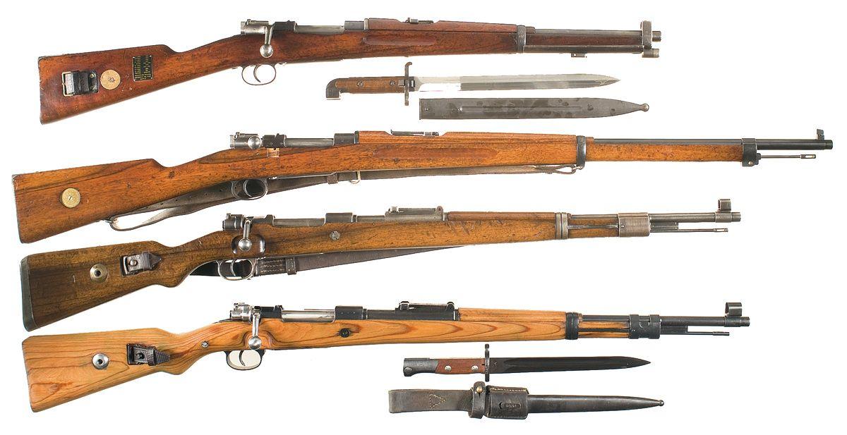 B) Receiver ring marked "Crown C / CARL GUSTAFS STADTS, GEVARSFAKTORI / 1908", importer markings on barrel, leather sling. Barrel bands and buttplate numbered to a different gun (968). Right side of stock has a cutout for a micrometer rear sight which is missing.