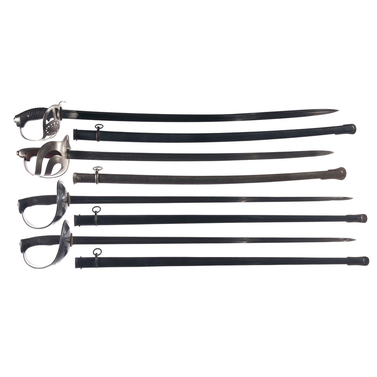 1) Argentine contract Weyersberg (Solingen) saber, 34 1/2" blade, checkered grip, sheath. Blade polished, markings defaced. 2) Saber, 33 1/4" blade, "0214/7" marked guard, wood grip, metal sheath. Fair. 3) Spanish sword, 35 1/4" blade, red accented guard decoration, checkered grips, metal sheath. Very good. 4) As 3, with Artilleria marked ricasso. Very good.