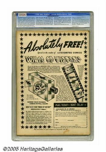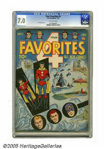 <B>Four Favorites #3 (Ace, 1942) CGC FN/VF 7.0 Off-white pages.</B></I> Long-time comics artist Jim Mooney contributed the cover illustration to this early superhero-themed issue. It was previously sold in 2004 as part of the Donald A. Lambert collection, and is accompanied by a certificate of authenticity. Overstreet 2005 FN 6.0 value = $150; VF 8.0 value = $305. CGC census 7/05: 1 in 7.0, none higher.