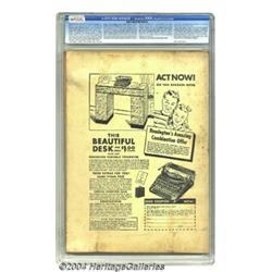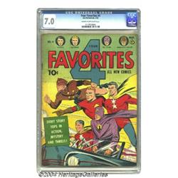 Four Favorites #4 (Ace, 1942) CGC FN/VF 7.0 Cream to off-white pages. Jim Mooney cover. Only copy of issue #4 to be certified by CGC to date. Overstreet 2003 FN 6.0 value = $129; VF 8.0 value = $258. Important notice: Heritage usually auctions material at the rate of 200-250 lots per hour. On some occasions eBay Live bid software or the Internet may not be able to keep up with the pace of the auction. We recommend placing a realistic absentee bid now as insurance to avoid disappointment. Occasionally the auctioneer may eliminate or reject an eBay Live bid, and the auctioneer may also reopen a lot after the close of the eBay live bidding (usually because we missed an audience bid), and may reject your bid even if it shows you as the winning bidder. By bidding via eBay Live, you agree that Heritage may award the lot to another bidder at its sole discretion under the circumstances described above or any other reasonable circumstances. Since eBay bids are not shown to us until we open the lot on the floor, we treat those bids just like floor bids. In most cases the floor responds before the eBay bid is presented to us, due to Internet lag time, so for consistency we have made it a policy that floor bids are always considered first over tie eBay live bids. Also please note that all Heritage lots purchased through eBay Live carry a 20% Buyer's Premium. Please make sure you read the Terms and Conditions before you bid.