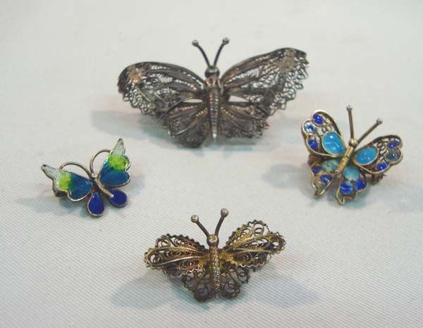 Four Filigree Butterfly Pins. The largest butterfly pin needs repair, it does not have the clasp pin. The smaller ones are stamped 800. Two are painted shades of blue. Filigree is a metalwork made with tiny beads and or twisted threads, usually of gold and silver, soldered together or to the surface of an object of the same metal and arranged in artistic motifs.
