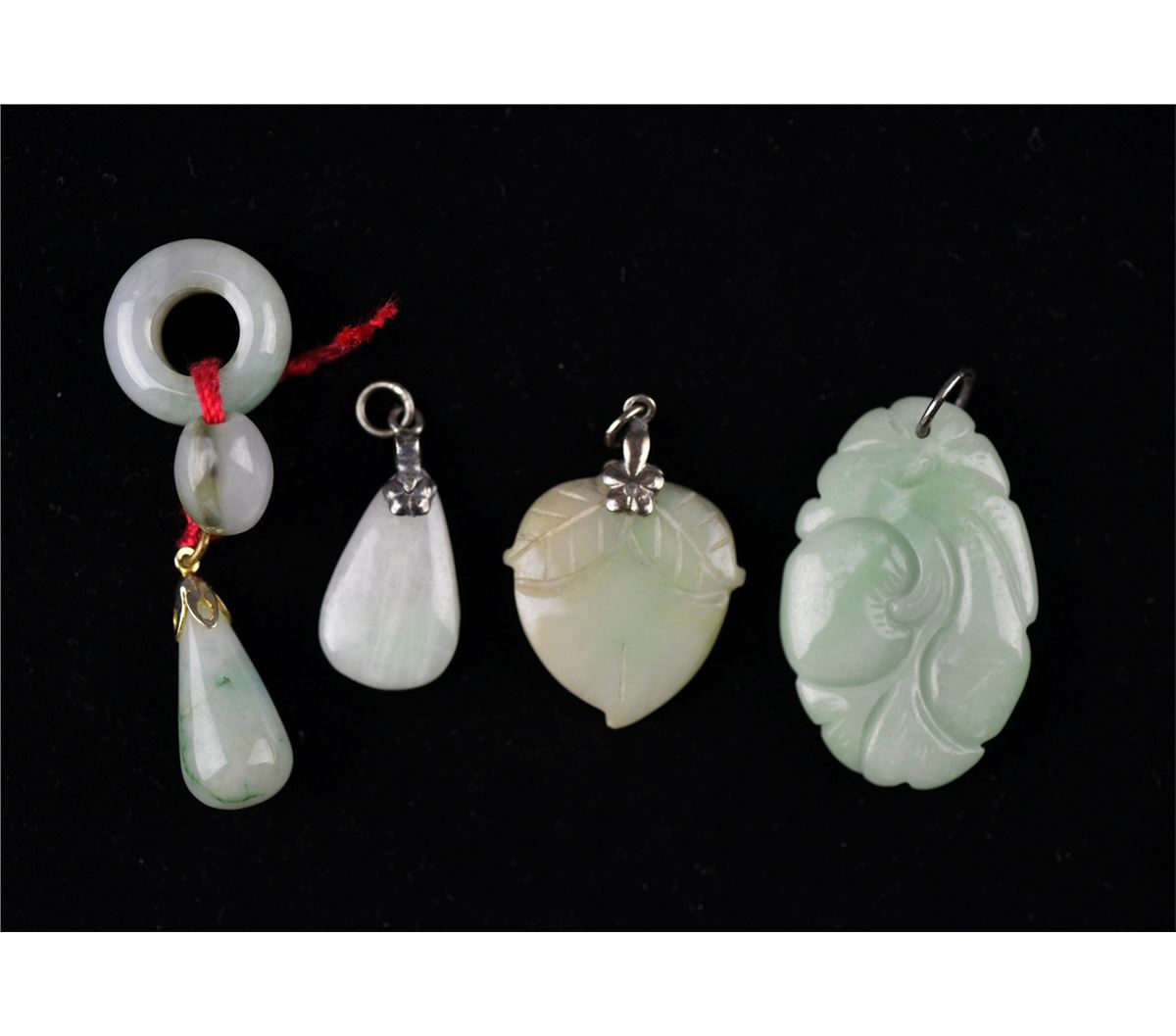 Four Finely Carved Chinese Jadeite Pendants. L: 5 cm (1); L: 2 cm (2); L: 2 cm (3); L: 4 cm (4); 26 grams (approx.)