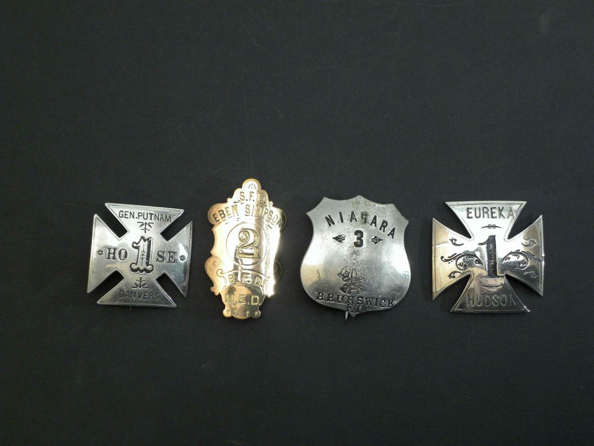 Four Firemen's Badges including Gen. Putnam Hose 1 Danvers, SFE Eben Simpson 2 BFD MED, Niagara 3 Brunswick FD and Eureka 1 Hudson. All in very good condition.