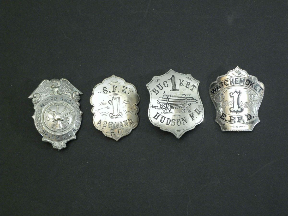 Four Firemen's Badges including White Angel Salem VFA, Watchemoket 1 EPFD, Bucket 1 Hudson FD and SFE 1 Ashland FD. All in very good condition.