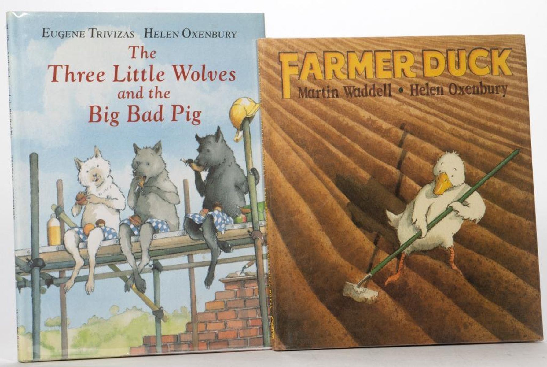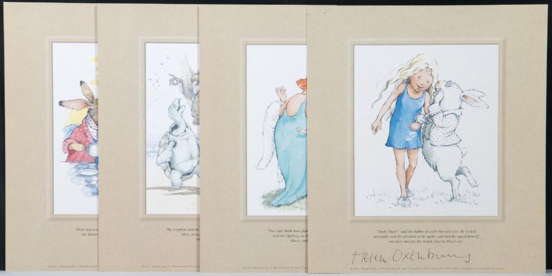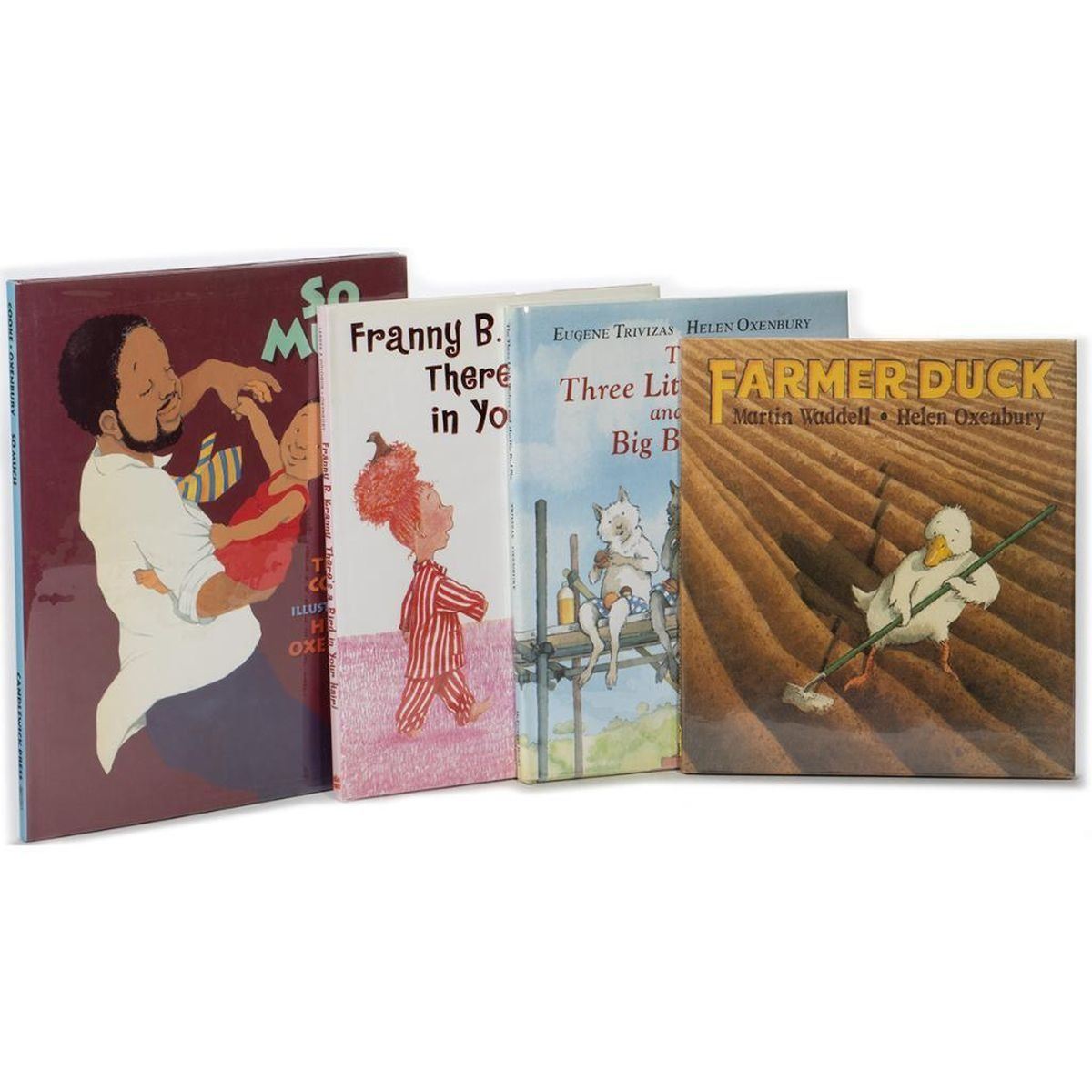 Four First Editions and Four Alice in Wonderland prints signed by Helen Oxenbury. The Three Little Wolves and the Big Bad Pig by Eugene Trivizas, illustrated by Helen Oxenbury. McElderry 1993 first edition. Illustrated hardcover in matching jacket. Signed by Oxenbury on the title page. Franny B. Kranny, Theres a Bird in Your Hair! by Harriet Lerner and Susan Goldhor, illustrated by Helen Oxenbury. Harpercollins 2001 first edition. Illustrated hardcover in matching jacket. Signed by Oxenbury on the title page. Farmer Duck by Martin Waddell, illustrated by Helen Oxenbury. Candlewick 1992 first edition. Illustrated hardcover in matching jacket. Signed by Oxenbury on the title page. So Much by Trish Cooke, illustrated by Helen Oxenbury. Candlewick 1994 first edition. Illustrated hardcover in matching jacket. Signed by Oxenbury on the title page. Together with 4 signed Alice in Wonderland prints on cardstock. All fine.
