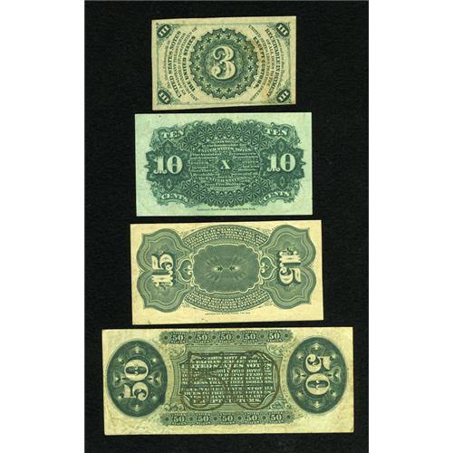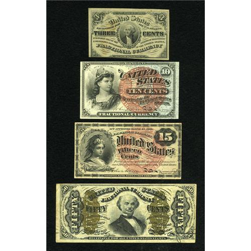 <B>Four Fractionals.</B></I><BR> Fr. 1226 3c Third Issue <B>About New</B></I>, staining<BR>Fr. 1261 10c Fourth Issue <B>Choice About New</B></I><BR>Fr. 1267 15c Fourth Issue <B>About New</B></I><BR>Fr. 1331 50c Third Issue <B>Fine</B></I>.<BR><BR><b>Shipping:</b> Coins & Currency (<a target="_blank" href="http://www.heritageauctions.com/common/shipping.php">view shipping information</a>)