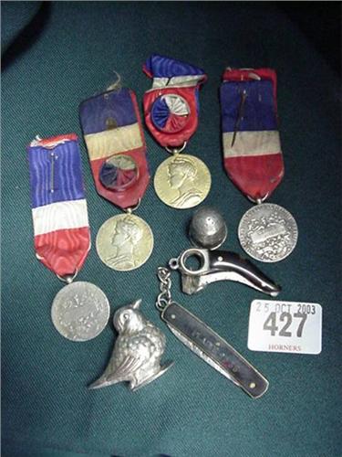 Four French Medals, Bird Design Container, Silver Thimble, Cigar Cutter And Knife £25-35...
