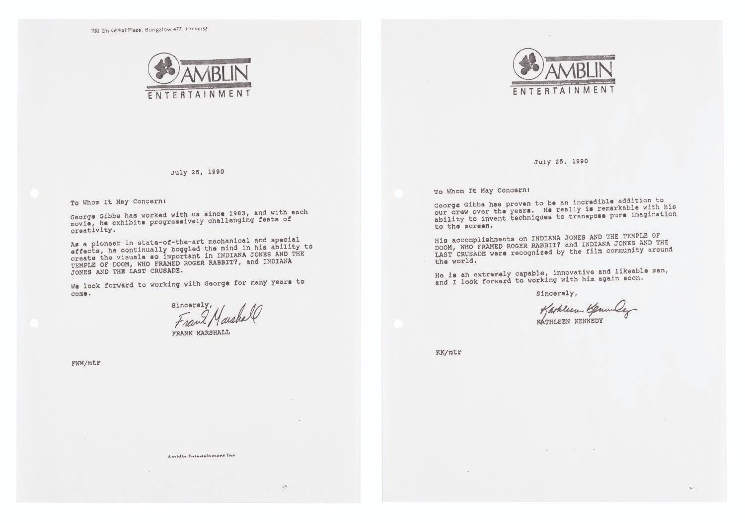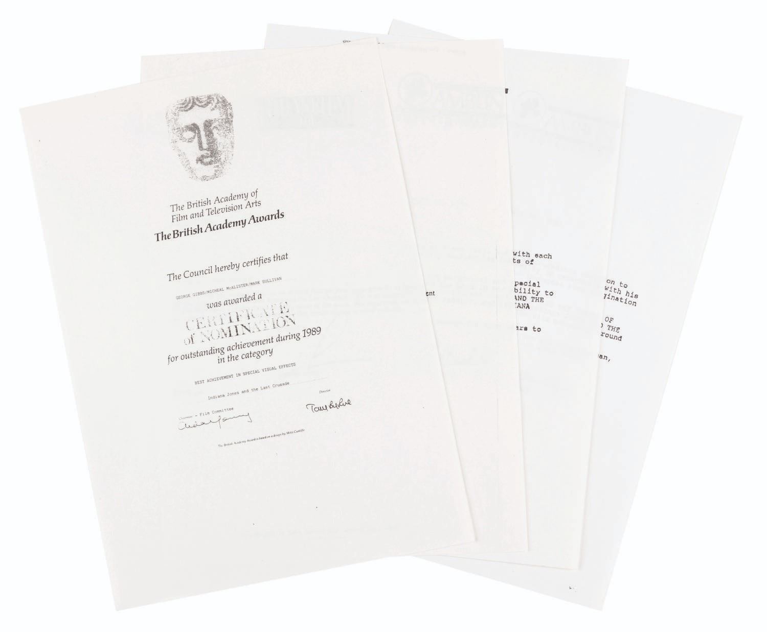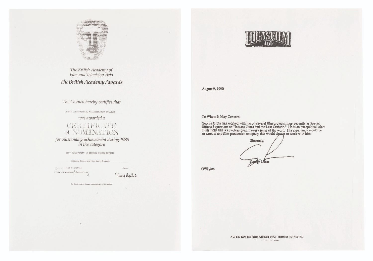 (Gibbs, 1989-90) Four photocopied pages from the portfolio of special effects artist George Gibbs. Included are three letters of recommendation from George Lucas, Kathleen Kennedy, and Frank Marshall, as well as a copy of Gibb's Certificate of Nomination for the British Academy Award for Best Special Visual Effects for "Indiana Jones and the Last Crusade." Measuring 8.5” x 11”, the pages are in fine condition.