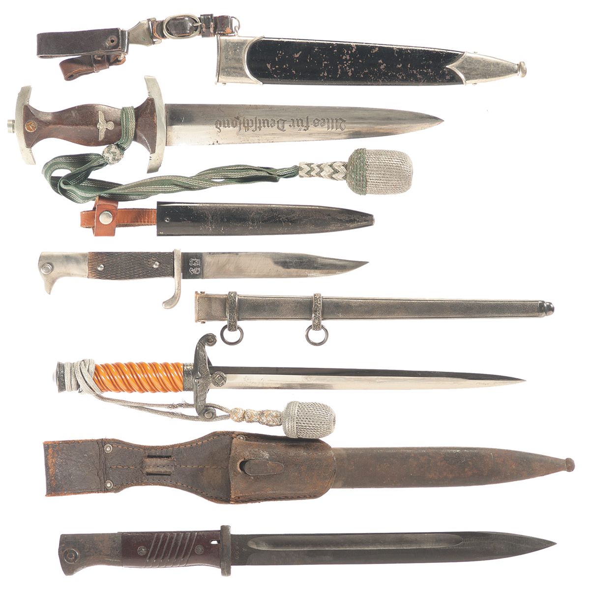 1 NSKK dagger with portapee and belt hanger, 1 WWII German bayonet with sheath and frog, 1 Nazi army dagger with sheath and 1 commercial production knife with sheath. All items are good.