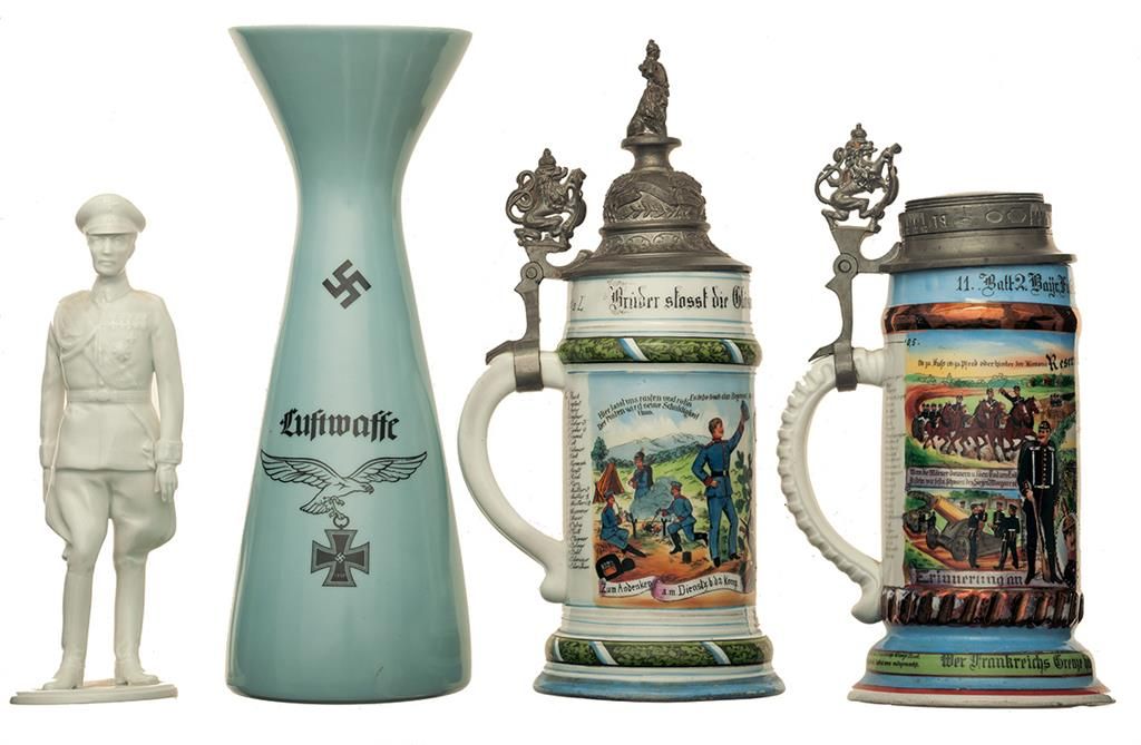 1) Porcelain vase, 11 1/4" tall with a white interior, light blue exterior, Luftwaffe/Iron Cross themed decoration, "Arsberg/403" in green on the underside. Excellent. 2) "SS/Allach" marked porcelain statue of a Nazi general officer, 8 1/2" tall, possibly depicting Erwin Rommel, the "Desert Fox". Excellent. 3) Imperial German polychrome stein for an Infantryman, 11 1/4" tall with an infantryman standing next to a lion on the pewter lid, 1905 dated field camp scene, and a lithopane of a courting soldier in the bottom. Very good. 4) Imperial artilleryman's commemorative stein, 10" tall with a round metric measuring tool threaded to the pewter lid, field scenes dated 1910-12, and a lithopane of a courting soldier in the bottom. Good, with some damage to the lid.