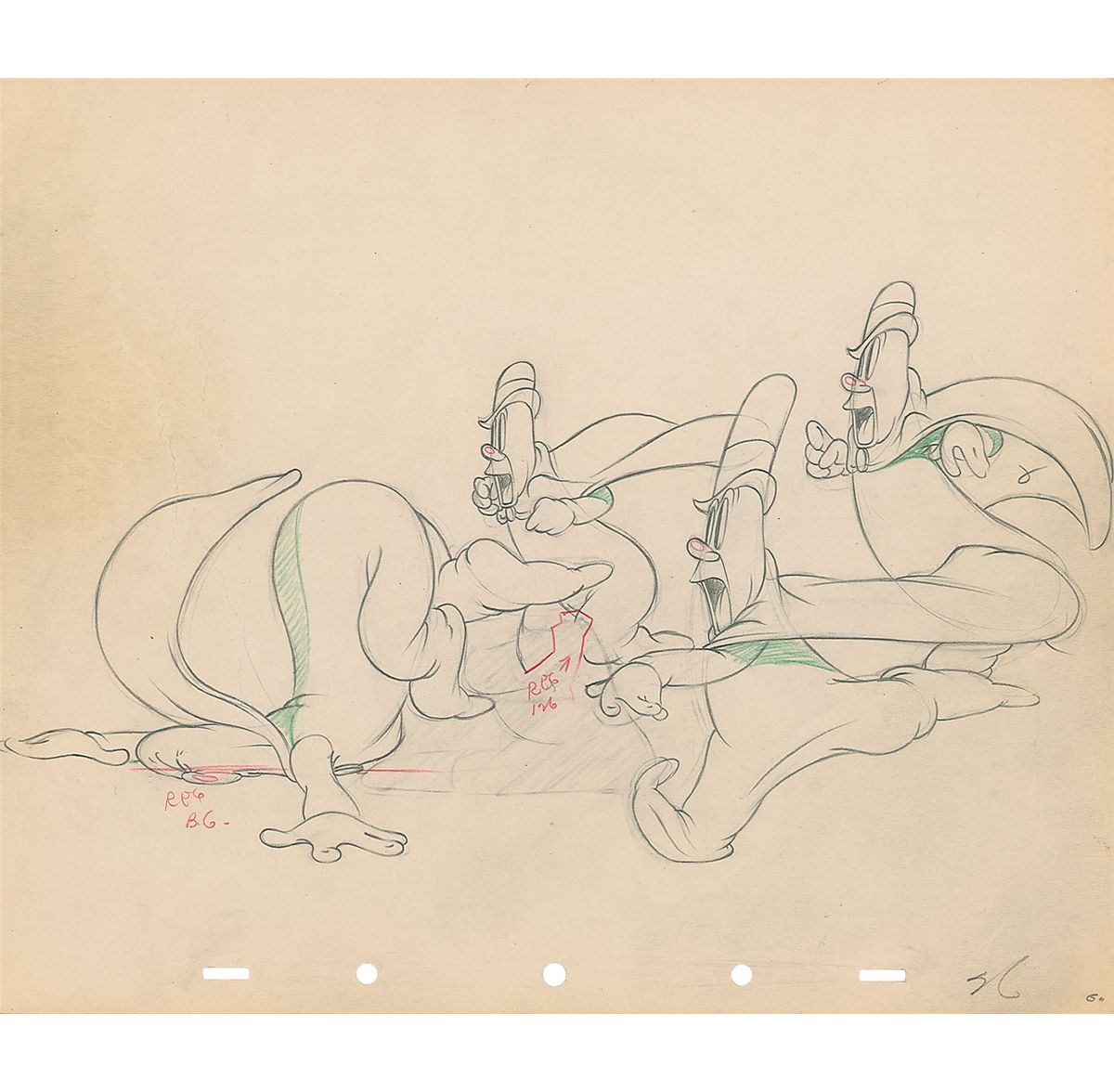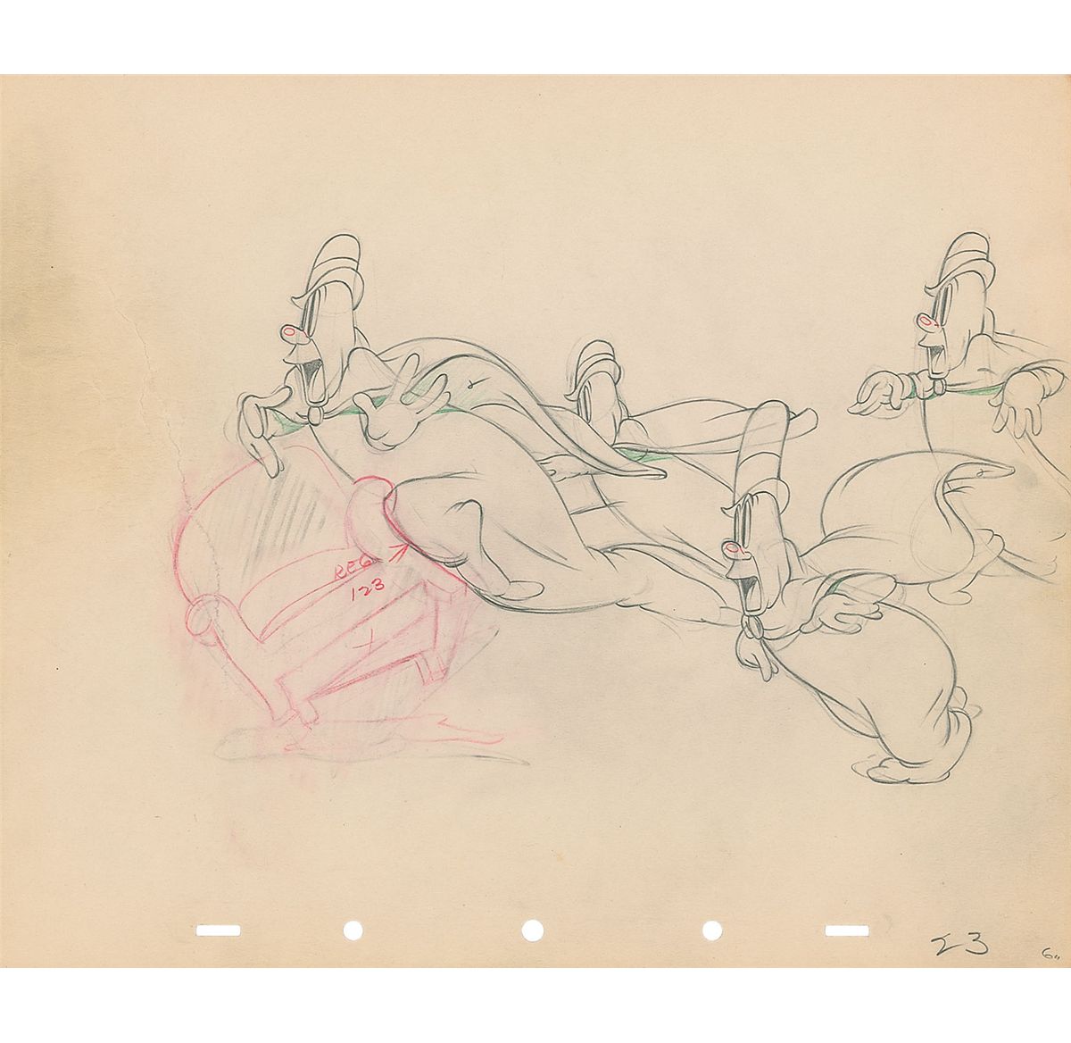 (Walt Disney Studios, 1937) Original set of two production drawings in sequence featuring the four ghosts from Lonesome Ghosts, depicting them sprinting through the air at one moment before hilariously tripping over an armchair and crashing onto the ground. Accomplished in graphite on two sheets of untrimmed 12 x 10 animation paper. Overall image sizes range from 10 x 6.5 to 12 x 6.5. In overall fine condition, with creases to the left side. A fantastic example of movement in animation and a great slapstick gag.