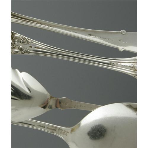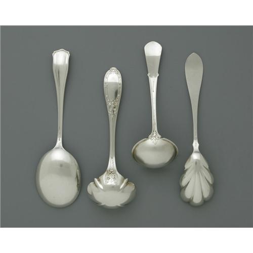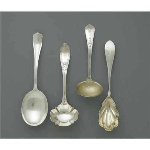 <B>Four American Silver Serving Spoons</B></I><BR>Gorham, Providence, RI; Shreve & Co., San Francisco, CA; and Albert Coles, New York, NY, Late Nineteenth Century<BR><BR>The lot comprising a Gorham parcel gilt jelly spoon; a Gorham cream ladle with an engraved and gilt bowl; a Shreve & Co. 'Dolores' pattern serving spoon; and an Albert Coles cream ladle, all with various monograms and hallmarked to the reverse<BR>The Shreve & Co. serving spoon: 8.6in. long