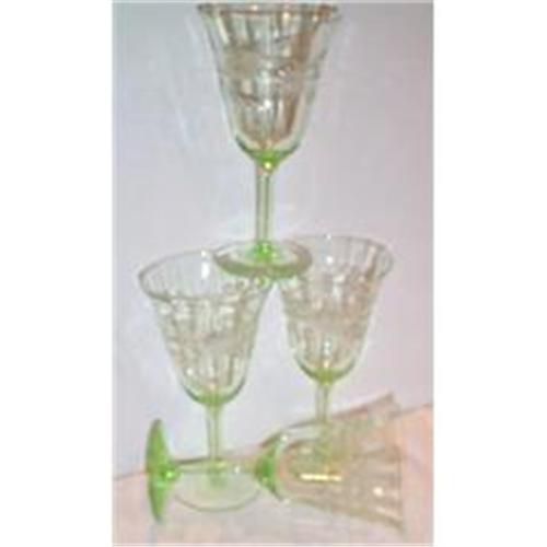 <tr><td>Title:Four Green Cut Cornflower Depression Goblets</td></tr>