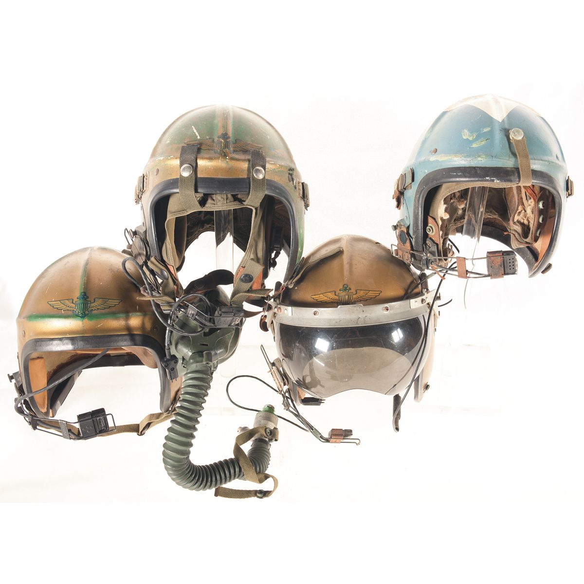 Three are gold finished over green, with one blue with a white star on the top. With 4 boom microphones, one inner liner, one visor and a face mask. Fair to good overall, with cracking and scuffs.
