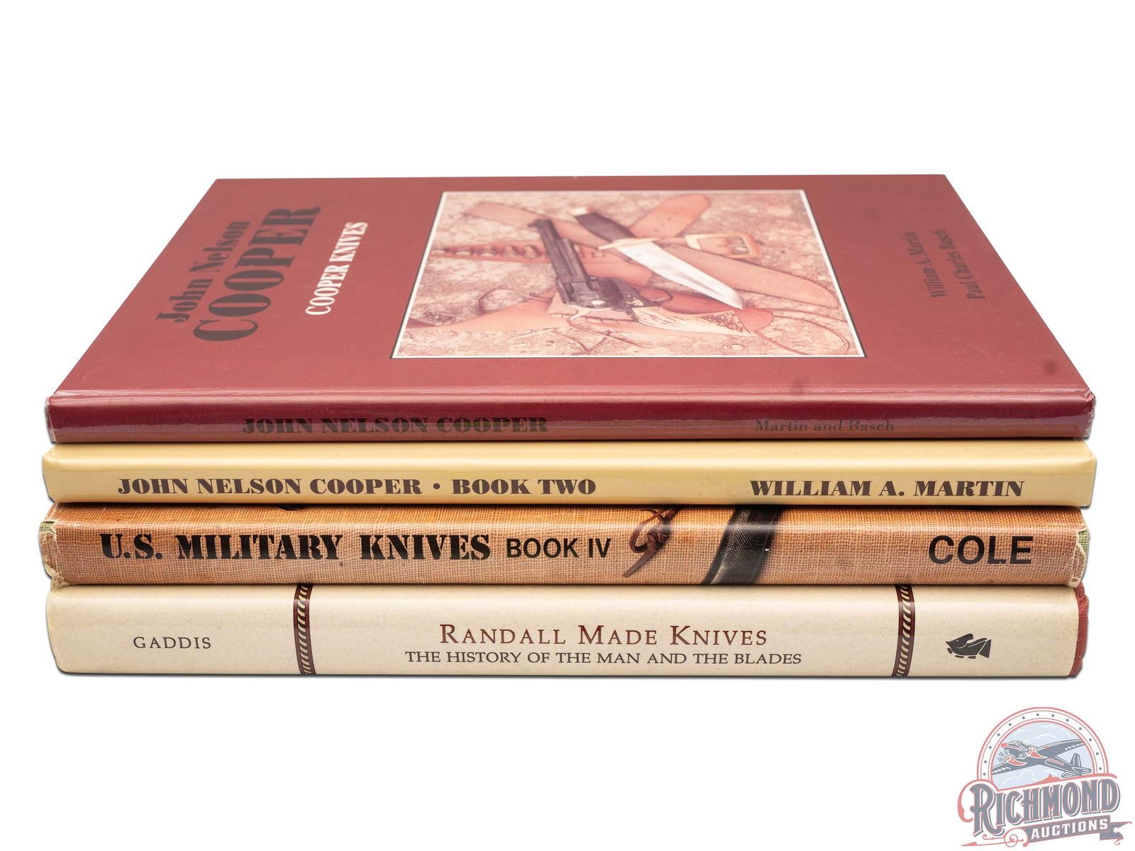 This lot includes the following: Randall Made Knives, The History of The Man and The Blades by Robert L. Gaddis. U.S. Military Knives Book IV, Bayonets and Machetes by M.H. Cole. John Nelson Cooper, Cooper Knives by William A. Martin and Charles Paul Basch. John Nelson Cooper Book Two Cooper Knives by William A. Martin.