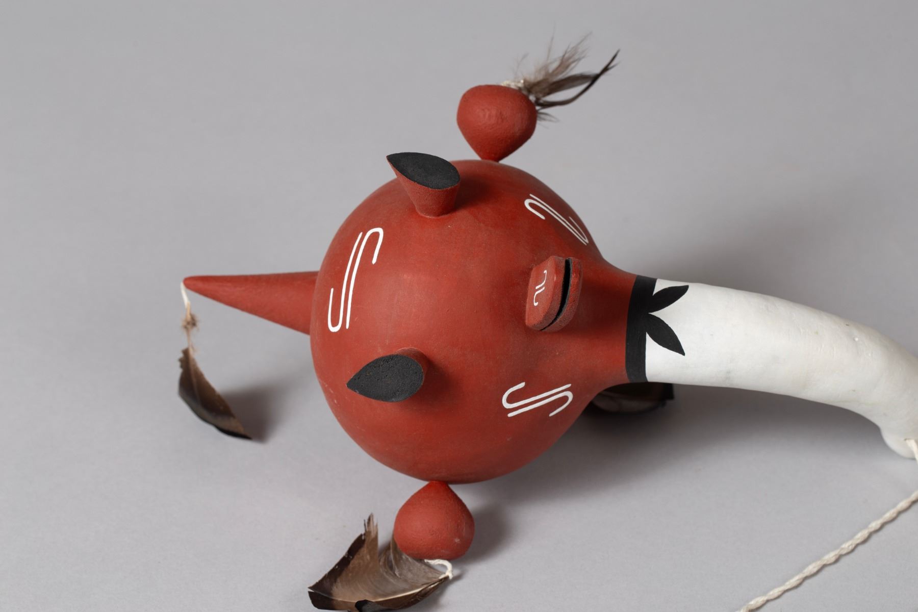 D) The rattle is a large, red, gourd-like object with a white, curved beak. It is decorated with black and white designs and has a string attached. This type of rattle is sometimes referred to as a "Rattle Racer Kachina Doll" (Aya).
