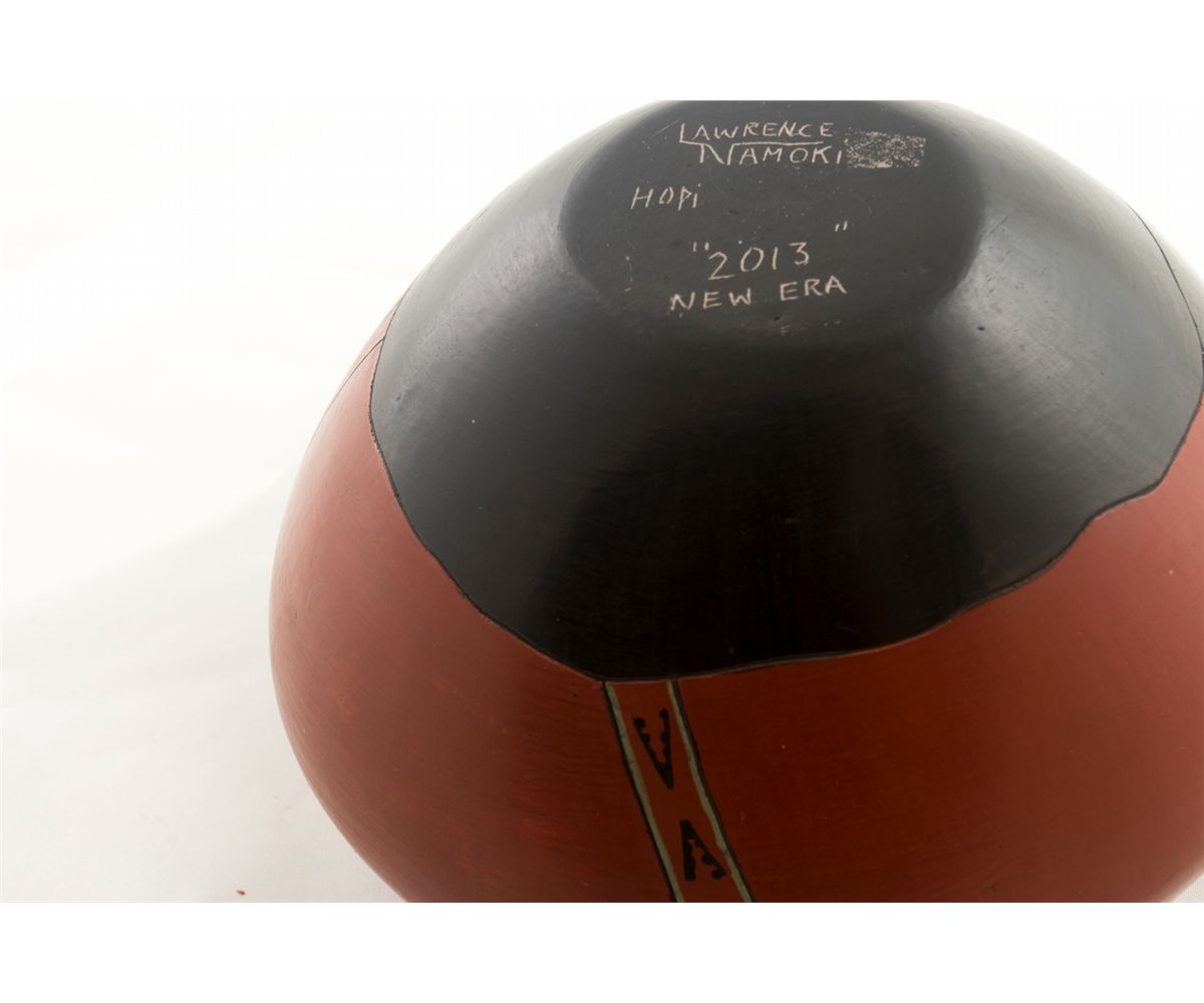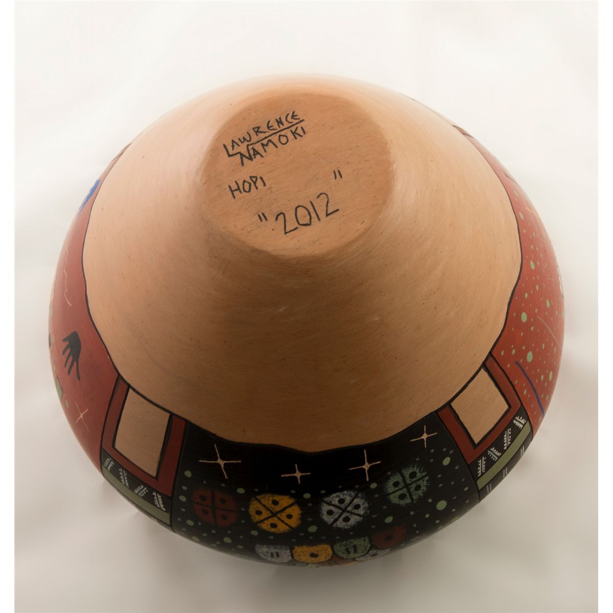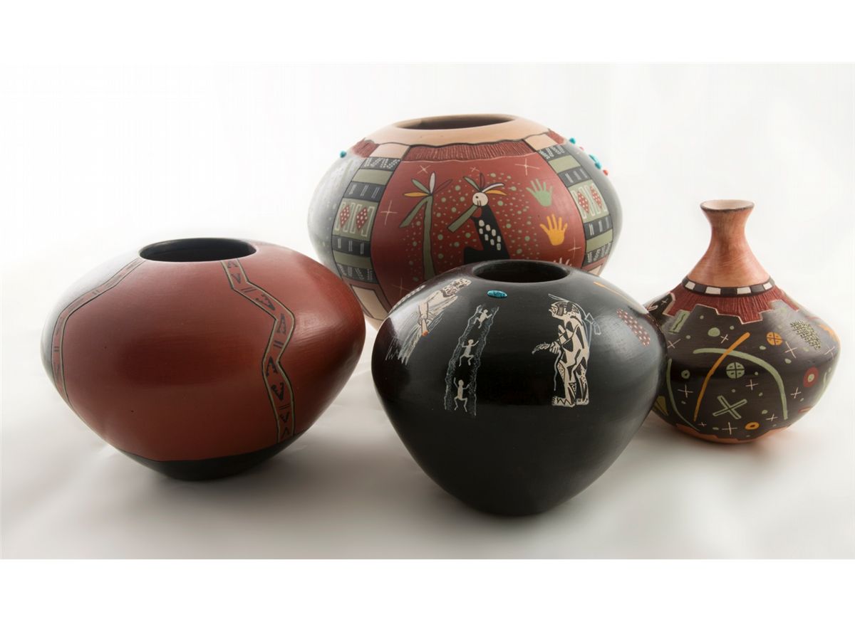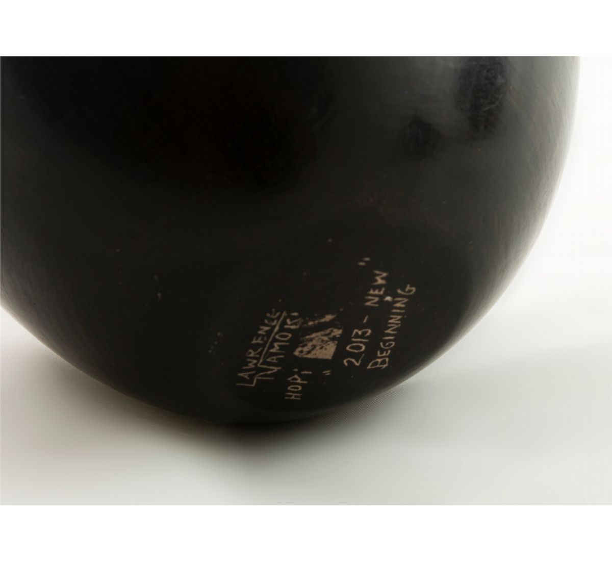 Four Hopi Pots by Lawrence Namoki (1949 - ). 1. 5" x 6.5". Elaborately painted designs embellished with semi-precious stone cabochons. Signed on base: LAWRENCE NAMOKI HOPI "2012". 2. 4" x 5.5". Stylized black and red designs. Signed on base: LAWRENCE NAMOKI HOPI "2013" NEW ERA. 3. 4.25" x 4". Carved and painted with various floating designs. Signed on base: LAWRENCE NAMOKI HOPI "SOLISTICE". 4. 4.5" x 3.25". Blackware pot with painted designs including two highly detailed figures. Signed on base: LAWRENCE NAMOKI HOPI "2013 - NEW BEGINNING". Provenance: Indian River Gallery.
