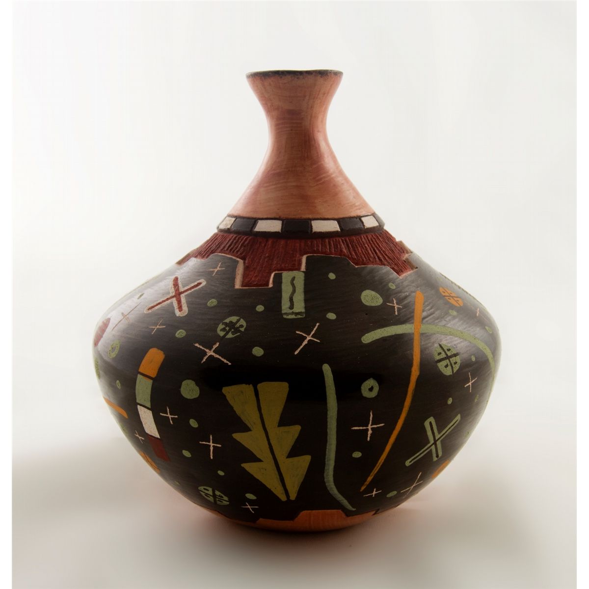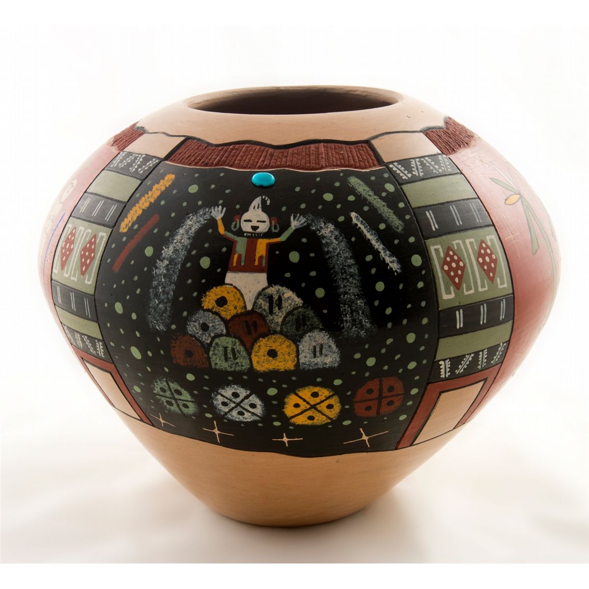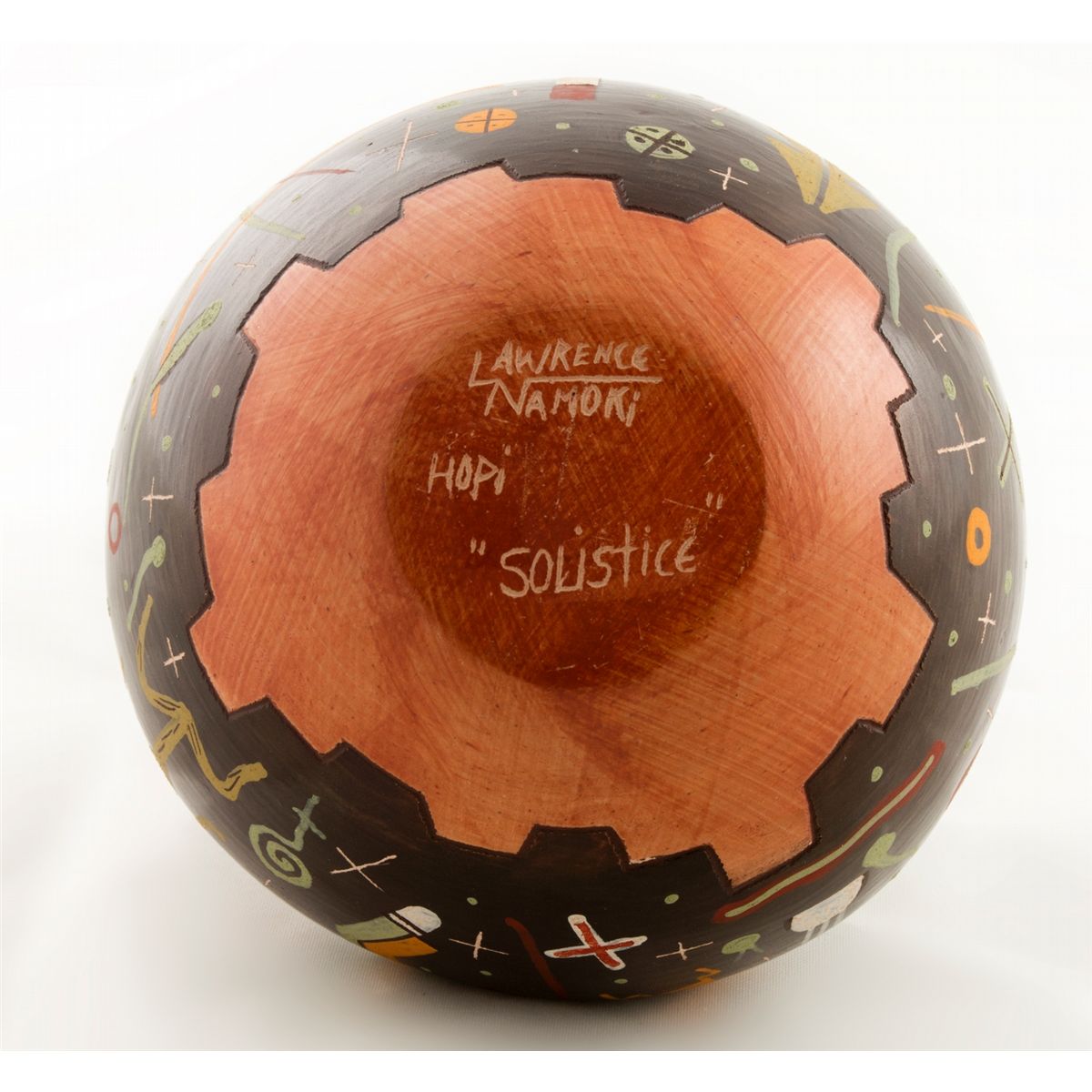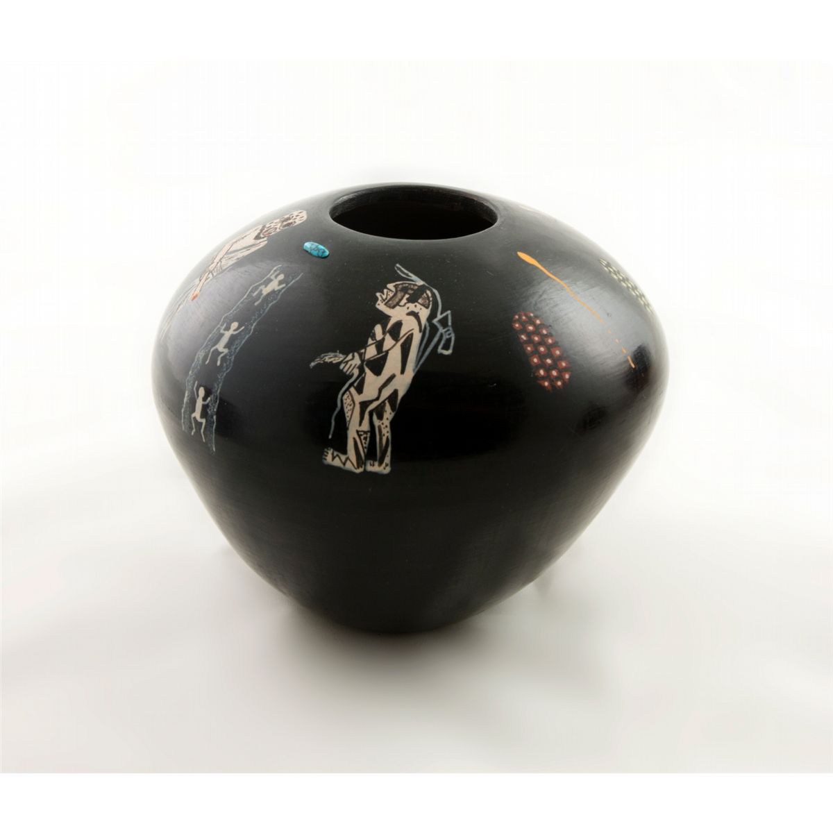 Four Hopi Pots by Lawrence Namoki (1949 - ). 1. 5" x 6.5". Elaborately painted designs embellished with semi-precious stone cabochons. Signed on base: LAWRENCE NAMOKI HOPI "2012". 2. 4" x 5.5". Stylized black and red designs. Signed on base: LAWRENCE NAMOKI HOPI "2013" NEW ERA. 3. 4.25" x 4". Carved and painted with various floating designs. Signed on base: LAWRENCE NAMOKI HOPI "SOLISTICE". 4. 4.5" x 3.25". Blackware pot with painted designs including two highly detailed figures. Signed on base: LAWRENCE NAMOKI HOPI "2013 - NEW BEGINNING". Provenance: Indian River Gallery.