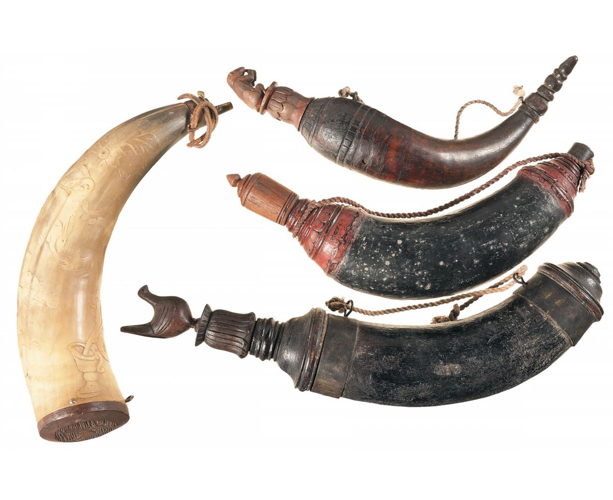 1) Horn flask, 11 1/2 inches overall, with carved borders at the top of the horn, raised beads at the tip, a cord hanger and a carved wood plug with a 3-dimensional rat carving. 2) Horn flask, 11 inches overall, black painted body with red painted carved ends, a wood and bronze end plug, a cord hanger and a carved hardwood plug. 3) Horn flask, 15 1/2 inches long, with a black painted body, wooden endcaps, a cord hanger secured to brass collars, and a carved hardwood plug with a 3-dimensional bird carving. 4) Carved horn, 12 1/2 inches long, with a deer carved on the wooden base cap, a leather thong on the upper suspension ring, and a spring loaded spigot sized for a 31 caliber or similar sized weapon. The horn is unpainted white, with carved designs of flowers, animals, the words "A Lo De", a man offering a hat to a deer, a pair of scissors, a hair comb and a straight razor. Yes, you read those last four items correctly, and no, we're not sure why they are there. If we were betting money, we'd say it was for a Spanish barber who was an avid outdoorsman in his spare time. Provenance: The William Ashby Collection