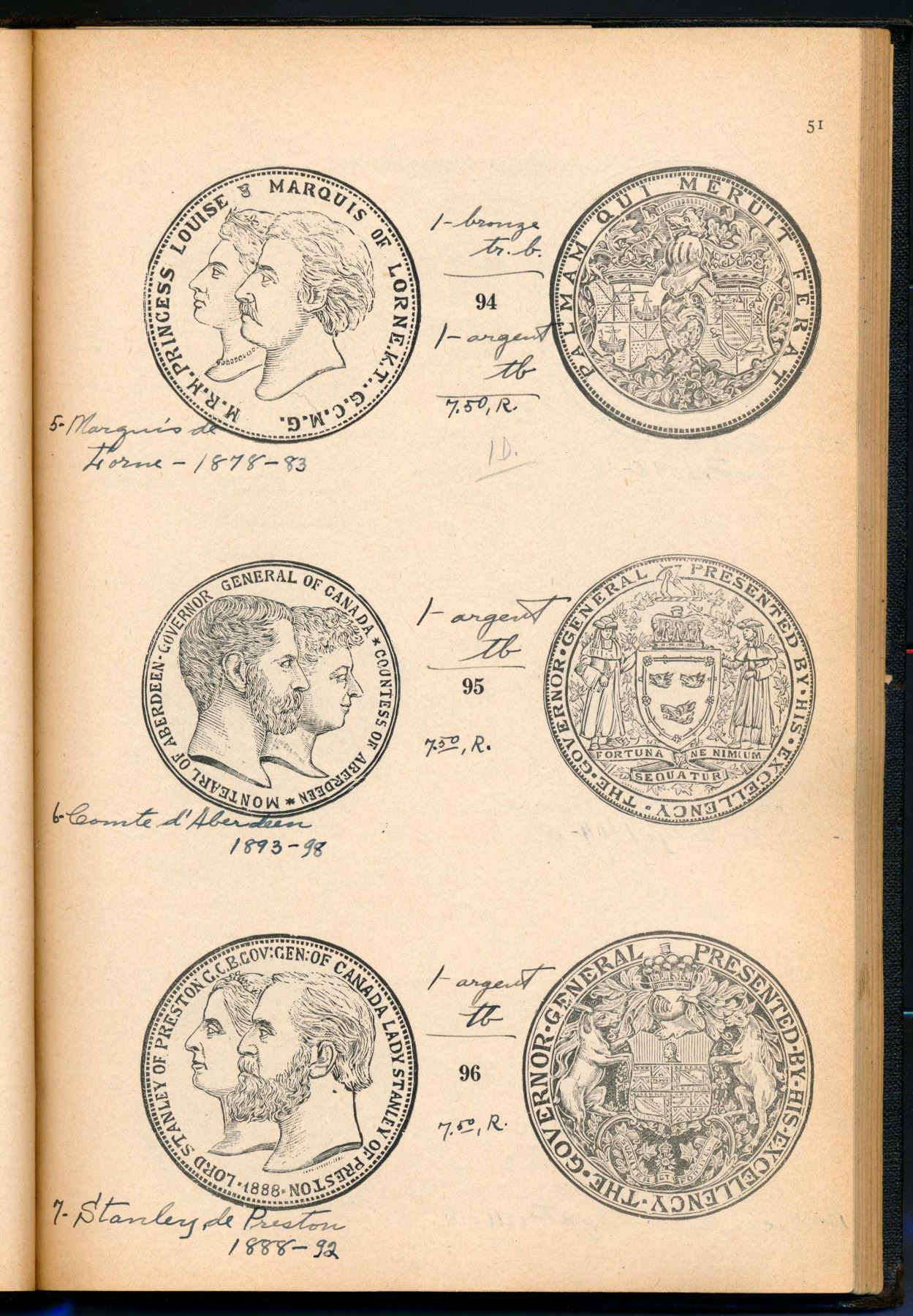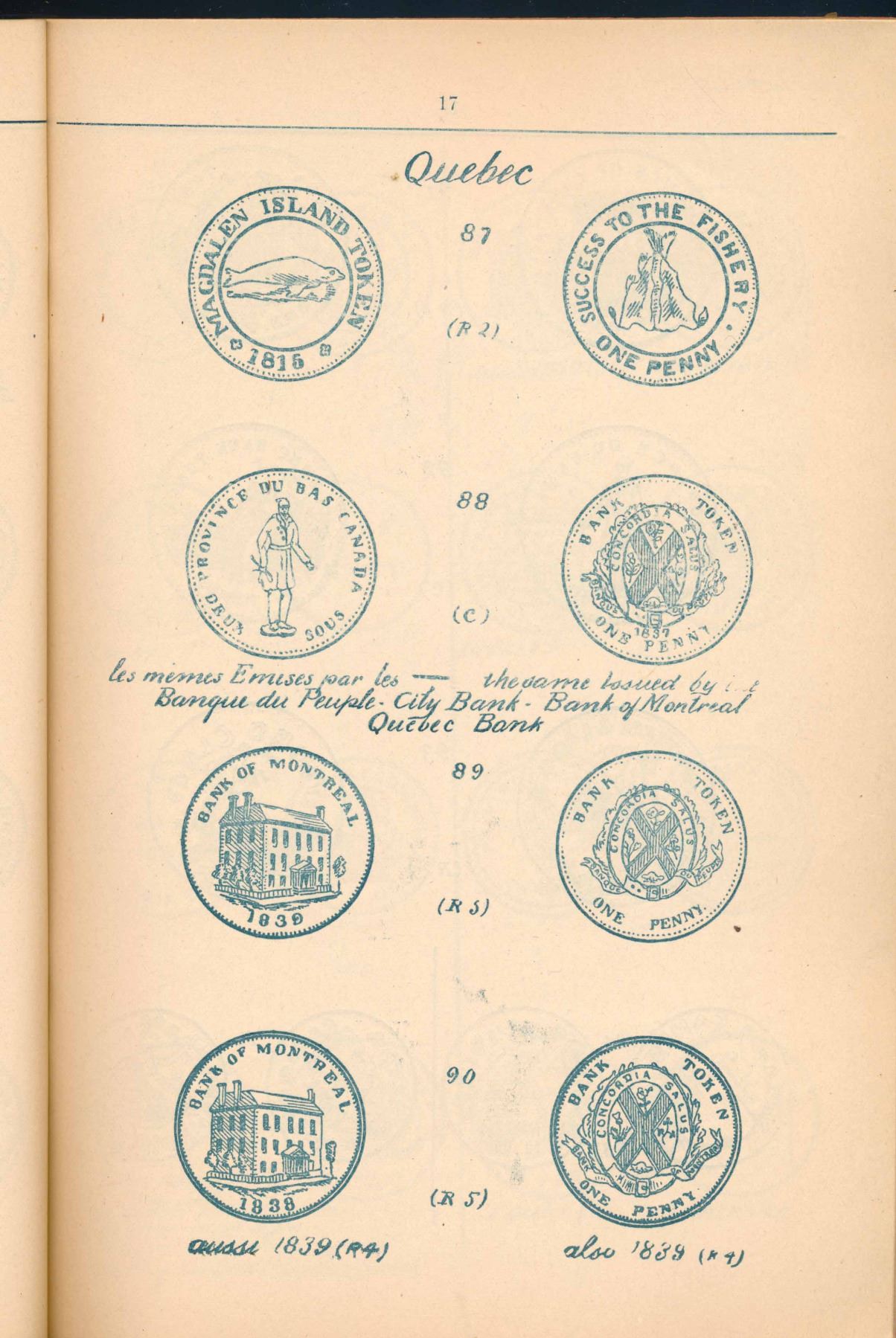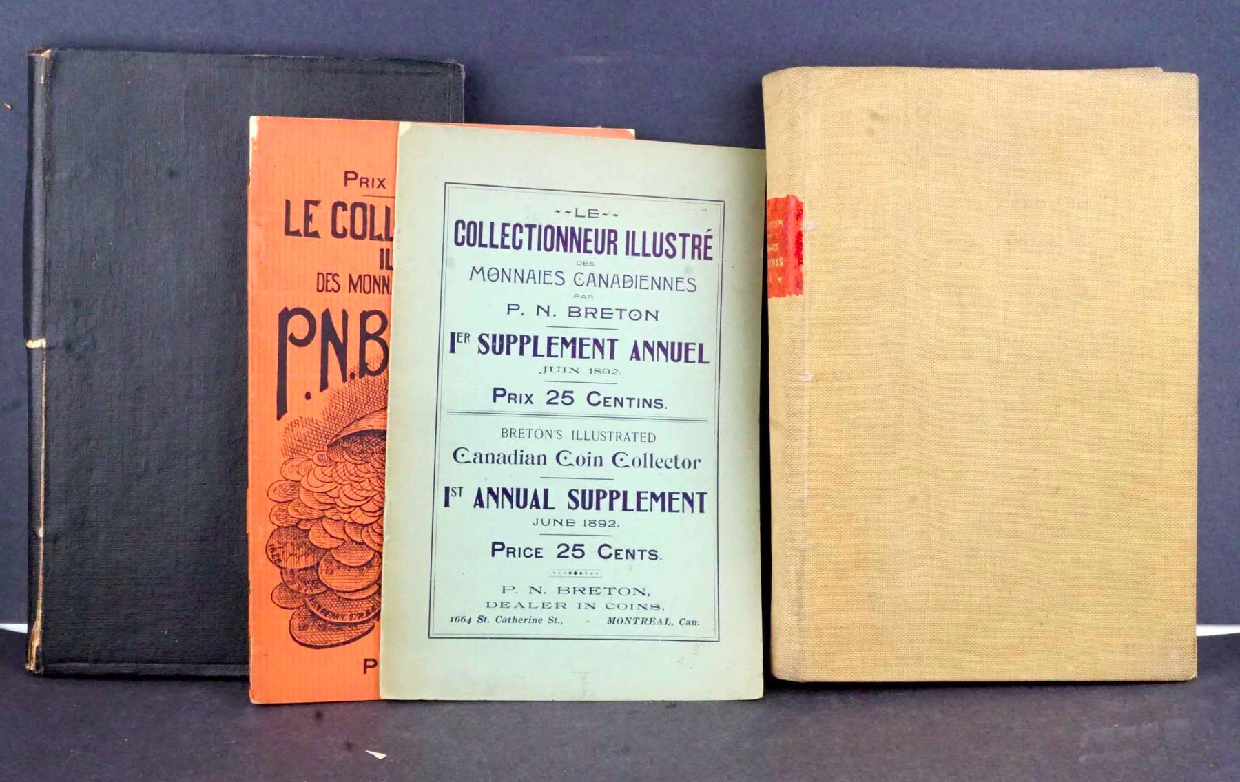 1) Two works bound together in hard tan cloth, with a spine label reading : P. N. BRETON --- MONNAIES ET JETONS --- I-II 1-A) Illustrated History of Coins and Tokens related to Canada 1894. Bilingual. Fair condition, with considerable annotation, clipped corners to separate the provincial issues, 240 pages. 1-B) Popular Illustrated Guide to Canadian Coins & Medals. 1912. Clean, complete, no annotations. 196 pages. Bilingual, but little text, almost entirely illustrations. , 2) Le Collectionneur Illustré des Monnaies Canadiennes. 1890. 48 page booklet, with reddish paper cover. Covers and internally excellent, though tearing along spine , both top and bottom, of about 25 mm each. 3) Le Collectionneur Illustré. 1st Annuel Supplement. 1892. 20 page booklet, green paper cover, tiny chip at top left. , otherwise excellent. 4) Popular Illustrated Guide. 1912. Bound in black cloth, broken on spine. First page inscribed to the Seminary Collection, and signed by Father Marcotte, 1926. Heavily annotated.