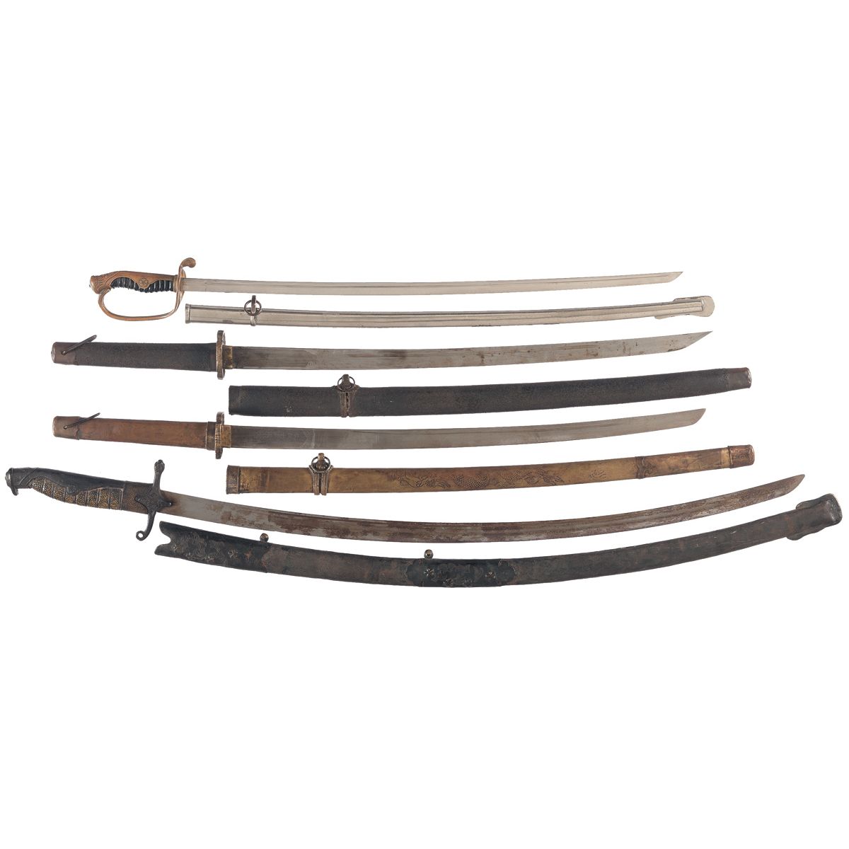 1) Sword, 26 1/2" blade, etched decoration, and metal hilt and scabbard. Fair. 2) Sword, 35 1/2" double fuller blade, naval style hilt, and metal scabbard with engraved brass throat and hanger. 3) Sword, 27" etched blade, wood grip and scabbard. 4) Officer's dress sword, 27 1/2" blade, artificial temper line, brass hilt, wire wrapped grip and nickel scabbard. All are fair or better.