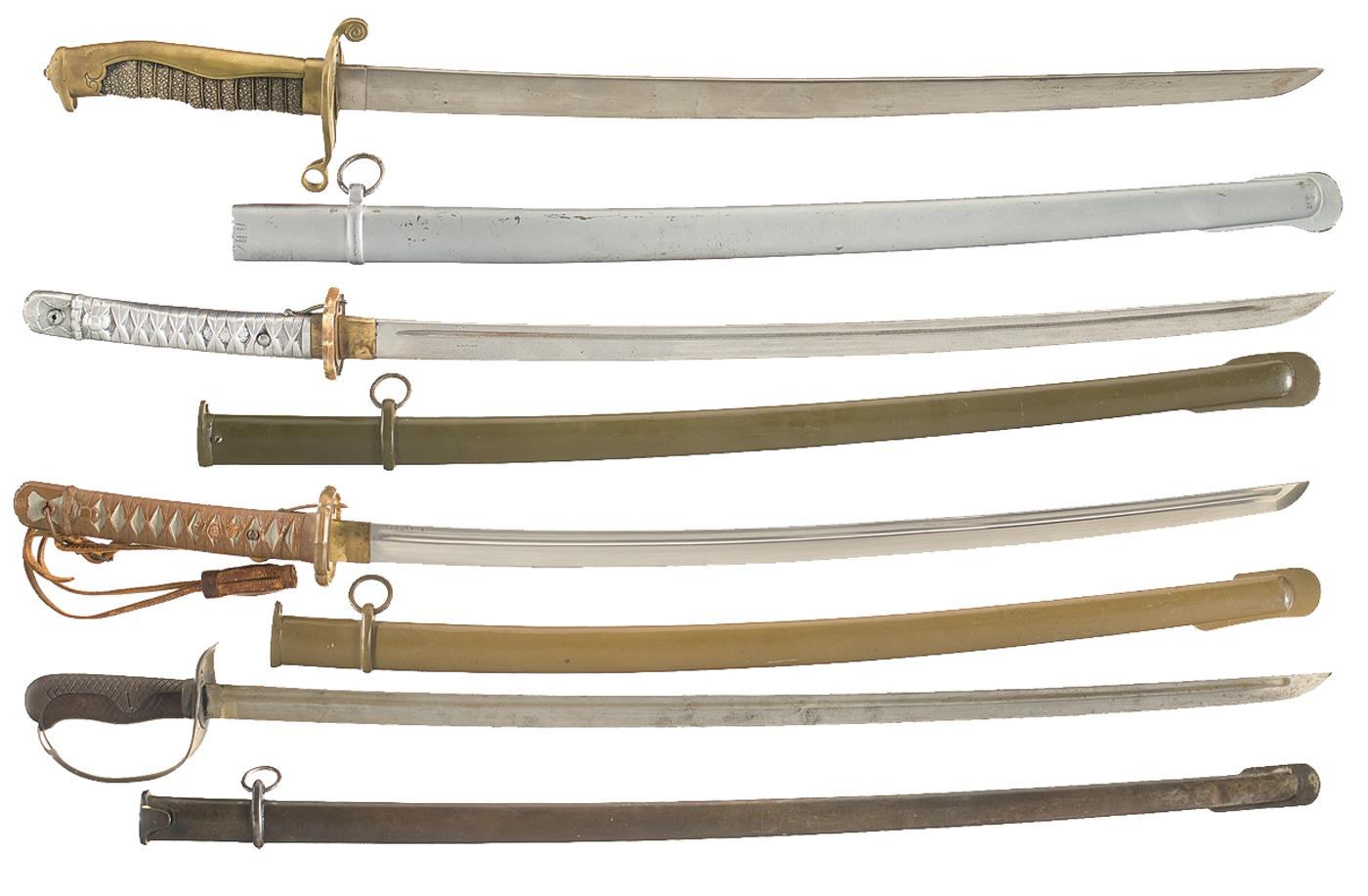 1) 1880 - 1900 Japanese Naval sword, shortened blade and scabbard, 21 inch blade with no hamon, nickel habaki, leather seppa, brass guard with loop for a chain guard, wire wrapped rayskin and star design on the rear. Alloy saya with added markings, the hilt cleaned bright. 2) WWII Japanese NCO sword, 27 inch single fuller blade marked "83271", copper tsuba, Kokura Arsenal marked fuchi, thumb retention clip, alloy tsuka and green painted saya. 3) NCO sword, as 2 with 27 3/8" blade numbered "132277" Jinsen Arsenal (Korea) mark, painted tsuka, leather sword knot and matching saya. 4) Type 32 Cavalry Sword, 32 3/4" single fuller blade with "81786" on the left ricasso, black painted handguard, checkered grip, metal sheath.