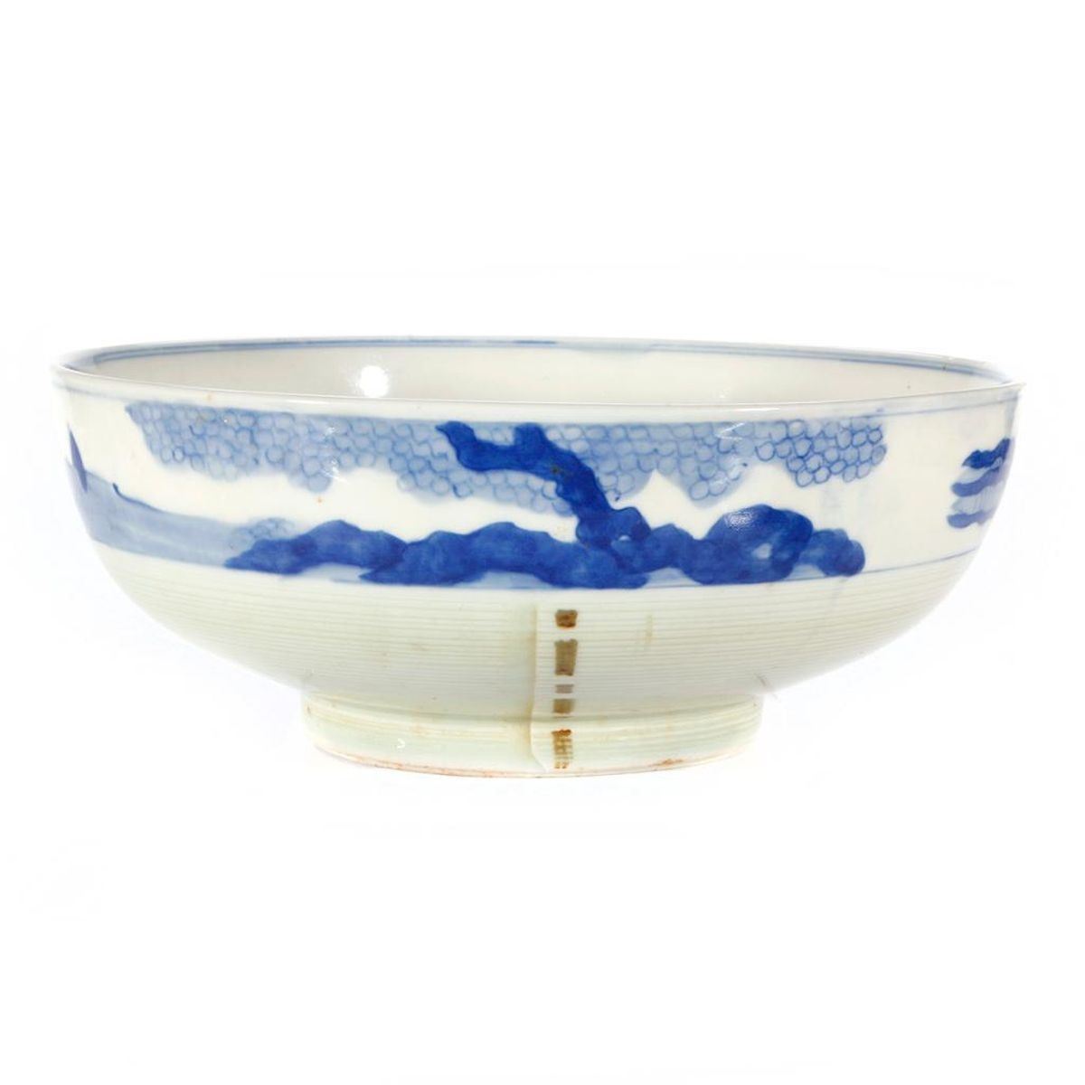 Four early to mid 20th century Japanese pieces including two porcelain bowls, the largest measuring 10 inches in diameter, a wooden mask and a wooden doll.