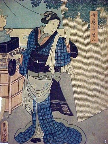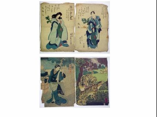 Four Japanese wood block prints on rice paper; each artist signed; one (tigers) is adhered to newspaper; each measures approximately 14" x 10" (three with holes and creases)