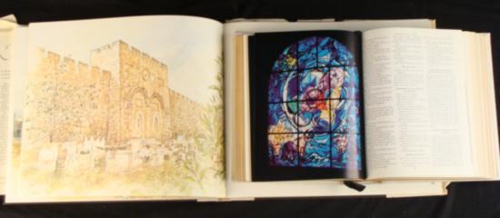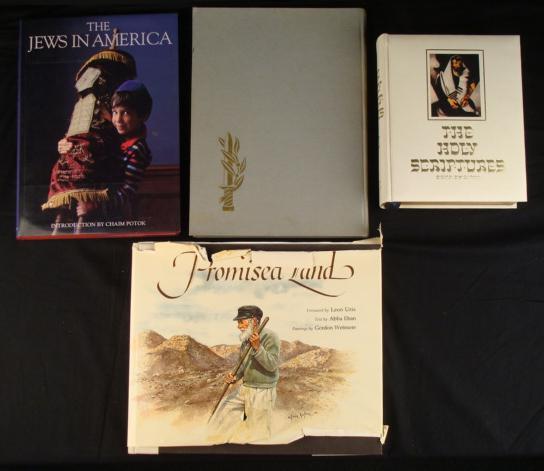 These are four Judaic books. All four are hard covers. In this lot you will receive: Commemorative Military book from 1948-1966. The entire book is in hebrew. It is full of wonderful military photos and descriptions of events that went on during Israel's first 18 years of establishment. The book is in very good condition with some slight staining to the cover The Holy Scriptures according to the Mesoretic text published by the Menorah Press in Chicago. The entire book details the five sections of the Torah, the prophets, and the writings of the holy scripture. There are several pages of beautiful photographs The book is in very good condition with the spine starting to separate. The Jews in America: The United States has the largest Jewish population of any country in the world. This vibrant and diverse community of nearly six million has flourished in America's atmosphere of religious freedom, tolerance, and enterprise. Photographs depicting Jewish customs and traditions are accompanied by clear, concise explanations which make this book accessible to Jews and non-Jews alike. Promised Land: This rich volume celebrates the uniqueness of a country whose history is inseparable from its spiritual heritage. In anticipation of the 50th anniversary of the founding of Israel in 1998, this portrait of a timeless land and its people reveals as never before the character of Israel, past, present, and future. With an inspired text by Abba Eban, an updated foreword by Leon Uris, and 82 beautiful watercolors and 35 pencil sketches by Gordon Wetmore, this volume is a work of art as well as a testimony of faith. The dusk jacket for Promised Land is ripped and tattered. This lot is a perfect way to brush up your Jewish history and heritage, bid now!