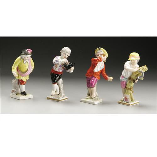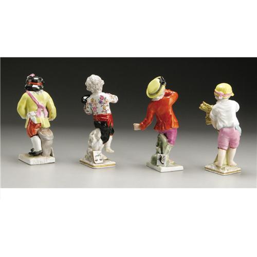 <B>Four German Porcelain Figures</B></I><BR><BR>KPM (Konigliche Porzellan Manufactur), Berlin, Germany<BR>Early Twentieth Century<BR>Porcelain, enamel, gilt<BR>Marks: in underglaze blue (KPM) with various impressed and inscribed marks<BR><BR>4 in. (tallest)<BR><BR>Group of four boys, allegorical of the months of the year, comprising August, September, October and April, each molded with the name of the month on the base and with various attributes and zodiac plaques.<BR><BR>Provenance:<BR>Walsh Family Art Trust<BR>4 Items <BR><BR><B>Condition Report:</B> Normal signs of wear as appropriate with age and small loss and repair to October