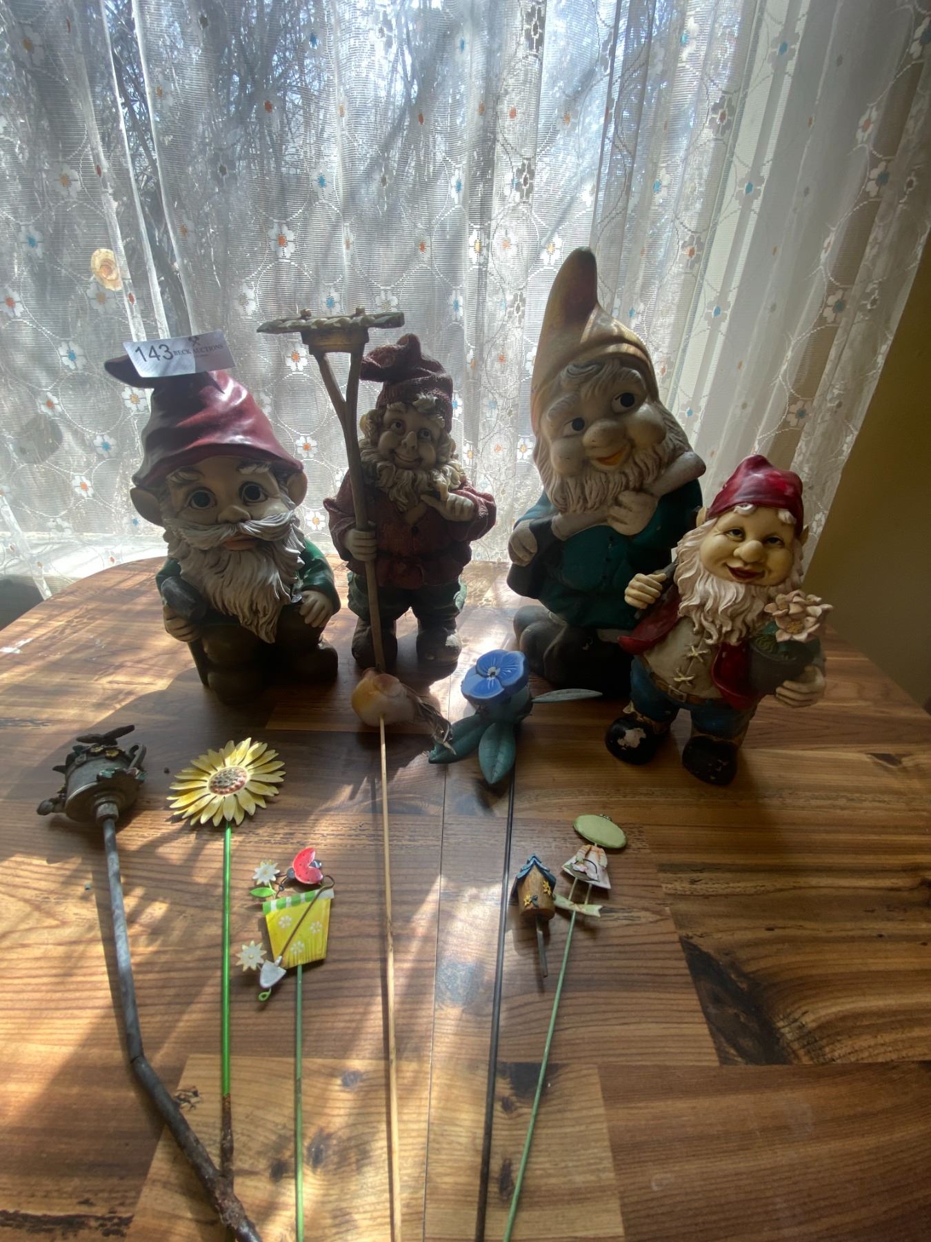 Gnomes That range between 10-14"h with a few decorative character sticks for your plant pot