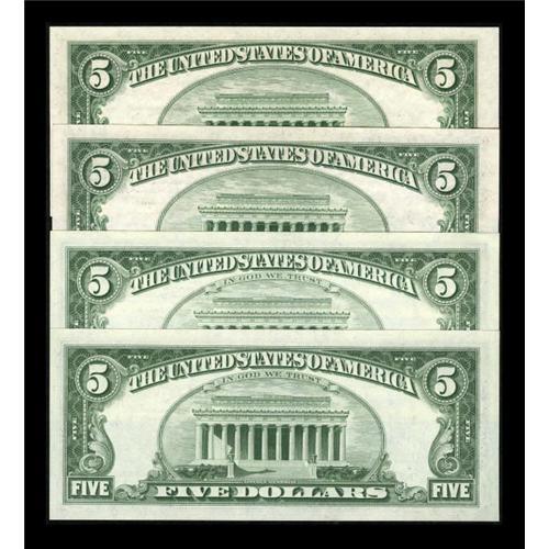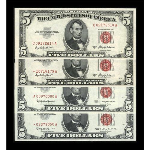 <B>Four Later Series $5 Legal Tender Notes. Choice Crisp Uncirculated or Better.</B></I><BR> Both regular and replacement notes for the series of 1953A and 1963 are included in this lot. With a bit better centering, these pack fresh examples would all be gems.<BR><I>From The Thomas M. Flynn Collection</B></I><BR><BR><b>Shipping:</b> Coins & Currency (<a target="_blank" href="http://www.heritageauctions.com/common/shipping.php">view shipping information</a>)
