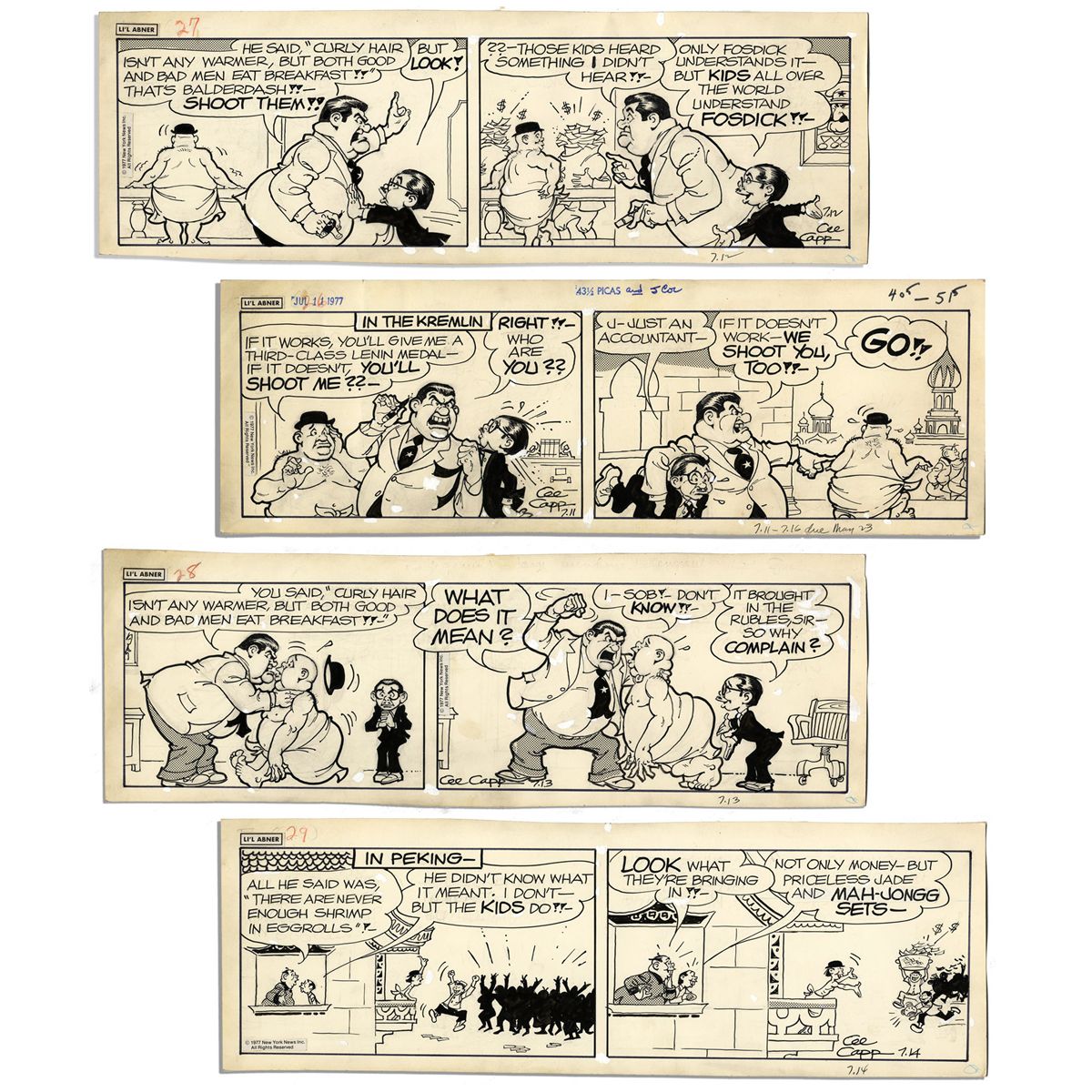 Four ''Li'l Abner'' Comic Strips-- 11-14 July 1977, The Last Year of The Strip's Run -- Drawn & Signed by Capp -- Russian Fosdick Storyline -- 18.75'' x 6.25'' -- Toning & White Out, Near Fine