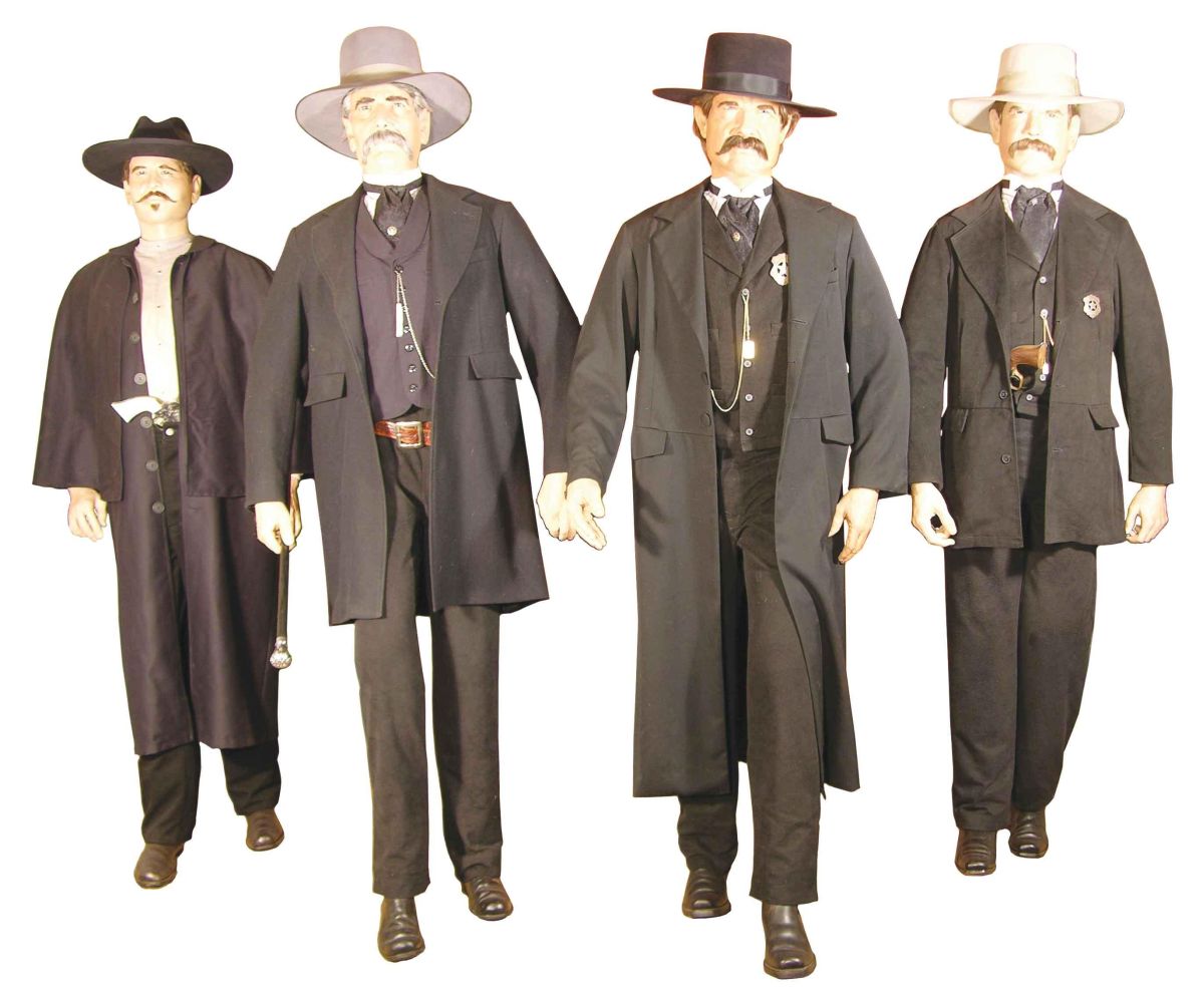 Four Life Size Figures including Val Kilmer as Doc Holiday, Sam Elliot as Virgil Earp, Kurt Russell as Wyatt Earp and Bill Paxton as Morgan Earp made by Steve Egge, Rough & Ready, California. Clothes from Wah Maker, supplier for Hollywood Costumes. This is as fine a resemblance of these four actors as you could possibly ask for.
