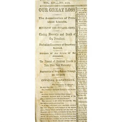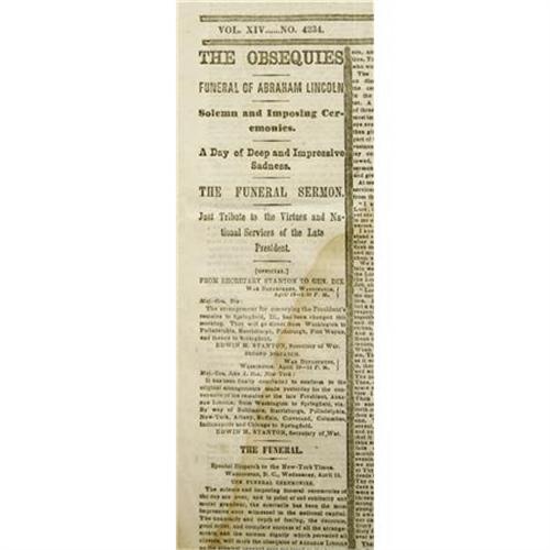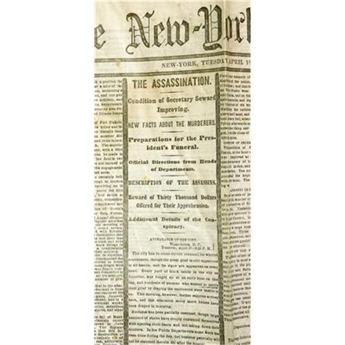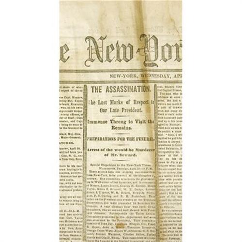 <B>Four Lincoln Assassination Issues of the <I>New York Times</B></I>,</B></I> 32 pp. total, folio, April 17 - April 20, 1865, aging as expected, some splits and stains. Overall good condition. Abraham Lincoln, shot on April 14, was dead by the time these editions went to press. The columns are all edged in black as a sign of mourning and speculate as to the future of the country. War news still appears from the South, the most important items being the capture of Raleigh, North Carolina and the impending surrender of Joseph Johnston's Army of Tennessee. Historically important, these papers allow the modern ready to enjoy pivotal American history in the present tense. <I>From the collection of Henry E. Luhrs.</B></I><BR><BR><b>Shipping:</b> Flat Material, Small (<a target="_blank" href="http://www.heritageauctions.com/common/shipping.php">view shipping information</a>)