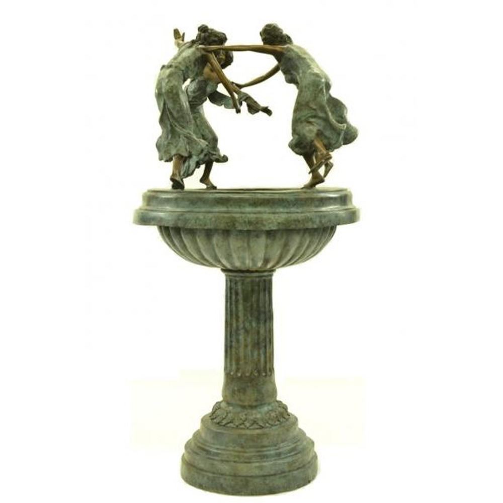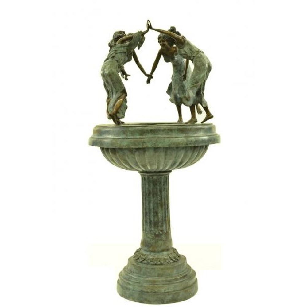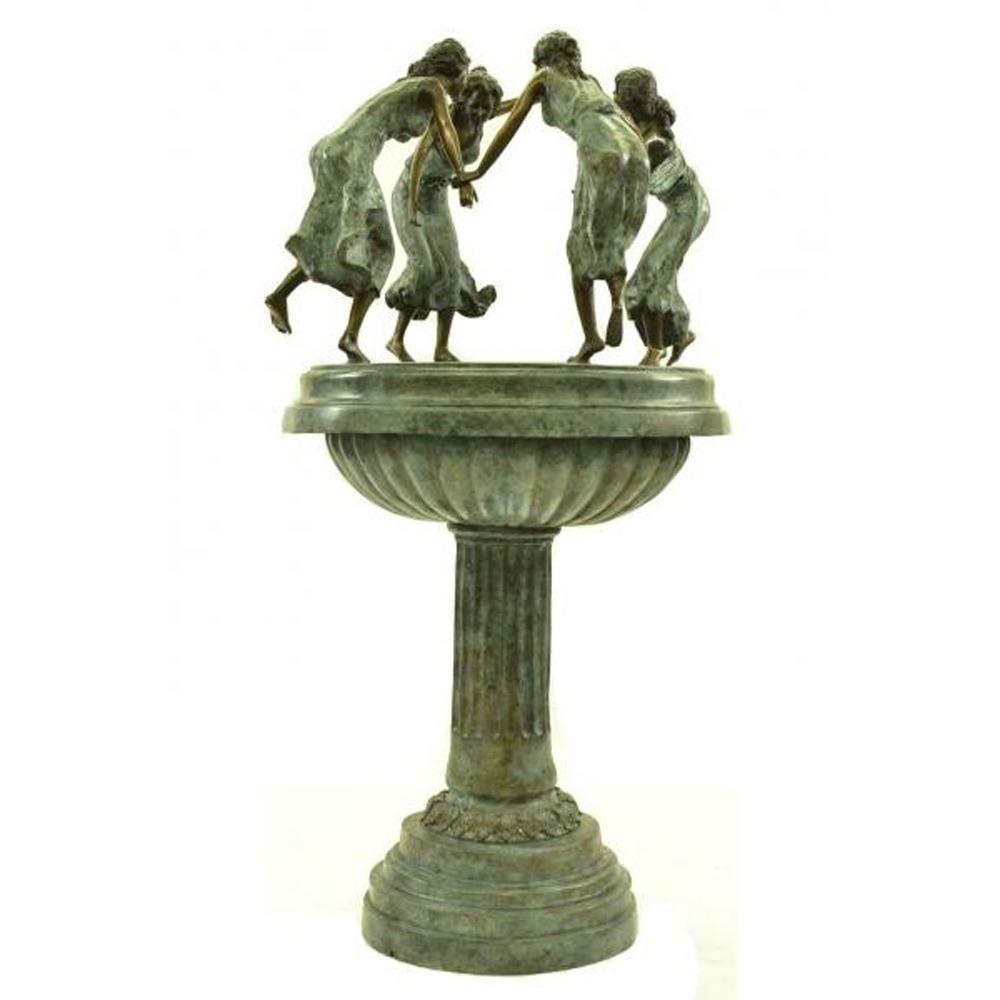 This figurative cast bronze fountain features four ladies dancing atop the urn style basin. An ideal focal point for a home or garden arrangement. This sculpture is colored with a natural Verde. The green patina of their flowing garments enhances the festive nature of this piece and compliments the fountain green base. Bronze Dimensions: Height 40 X Width 28 inches. Weight: 120 LBS.