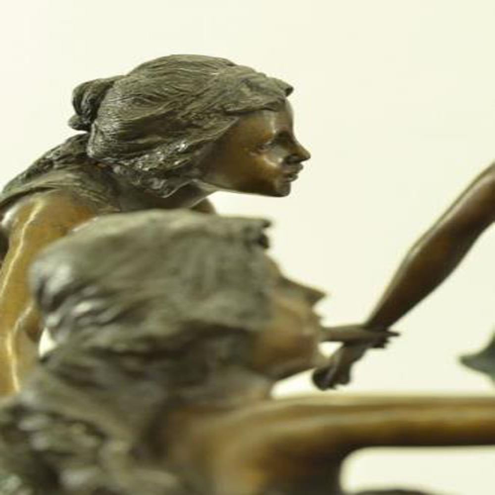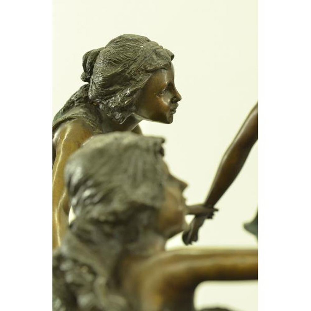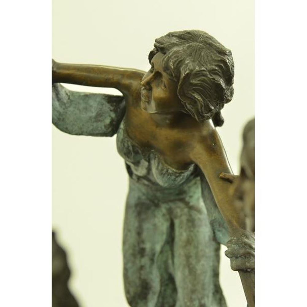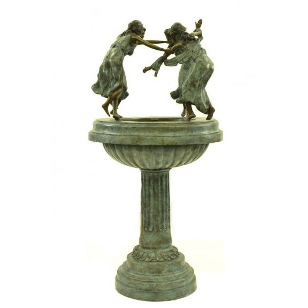 This figurative cast bronze fountain features four ladies dancing atop the urn style basin. An ideal focal point for a home or garden arrangement. This sculpture is colored with a natural Verde. The green patina of their flowing garments enhances the festive nature of this piece and compliments the fountain green base. Bronze Dimensions: Height 40 X Width 28 inches. Weight: 120 LBS.
