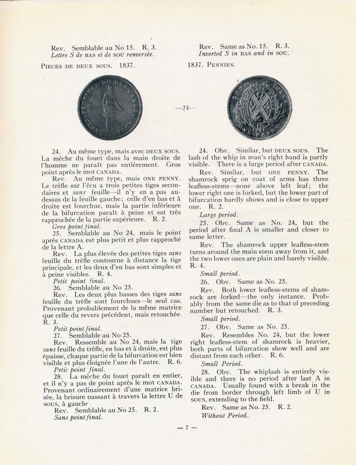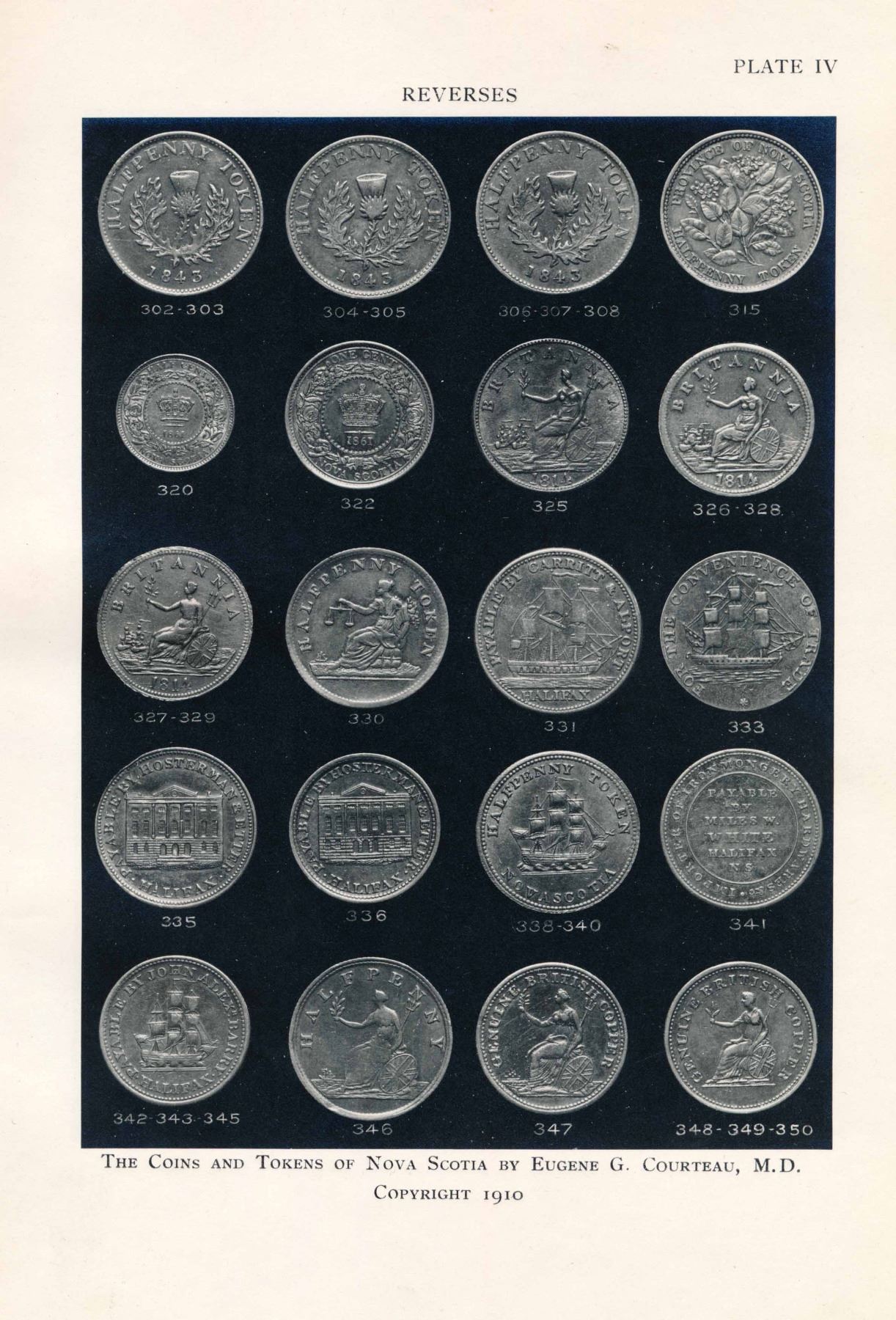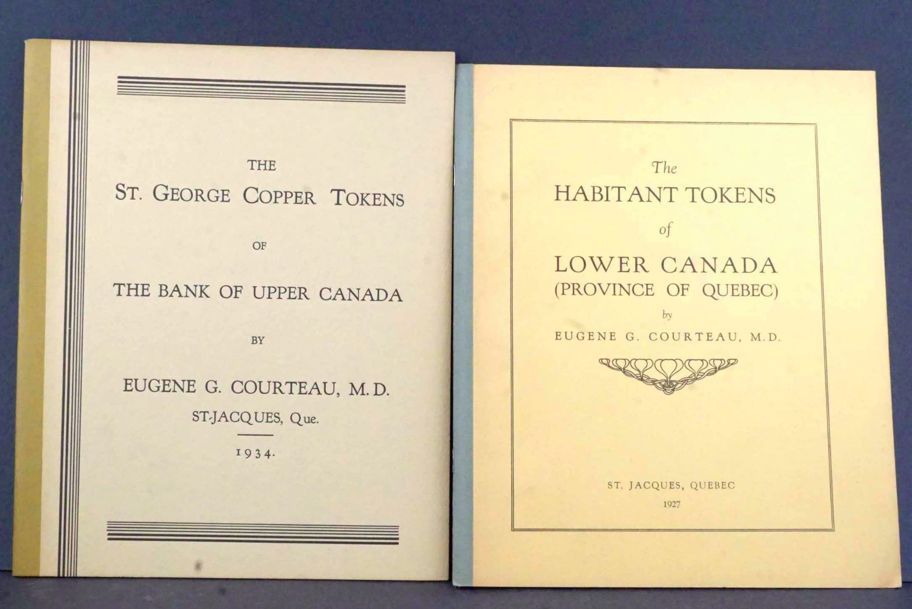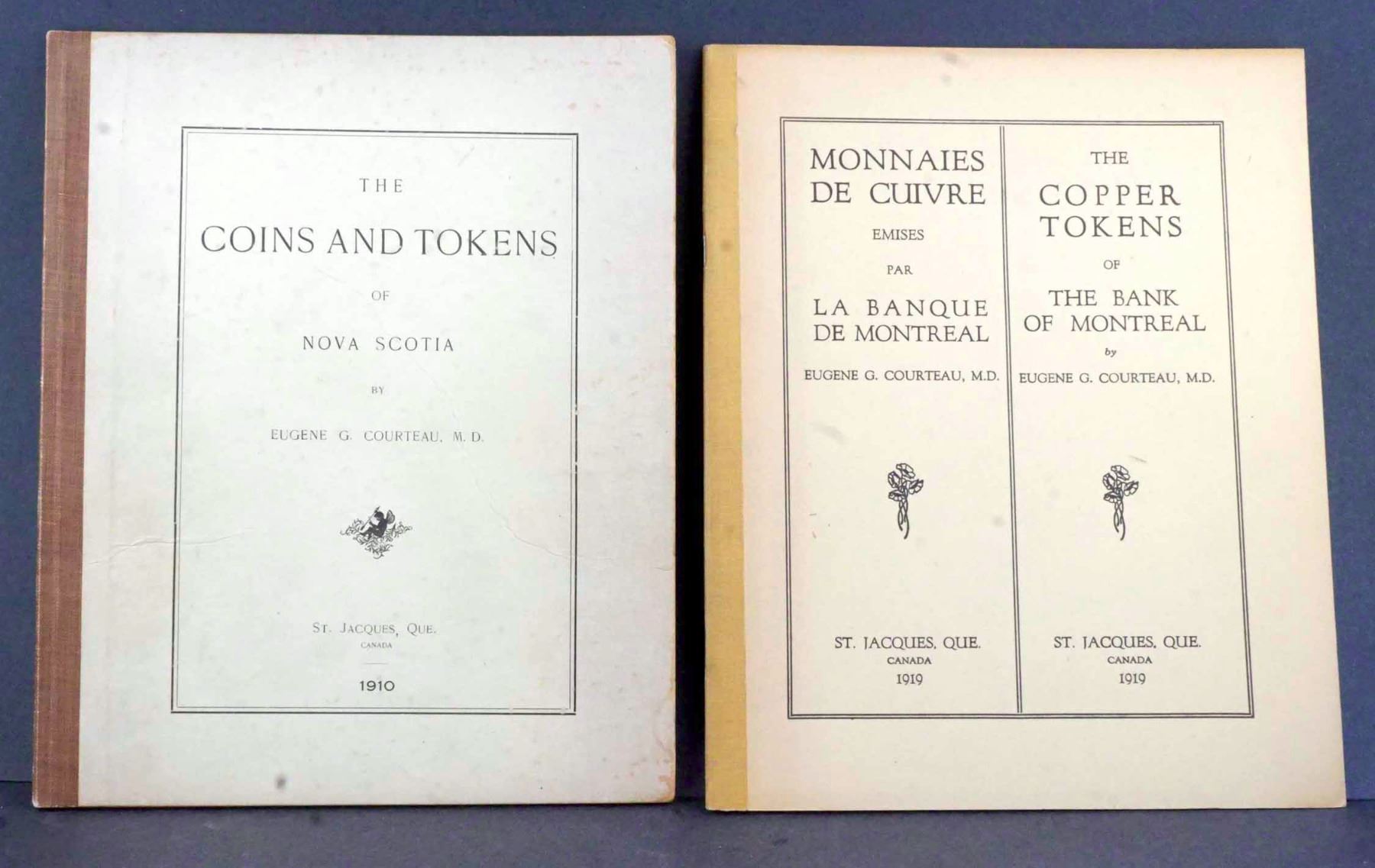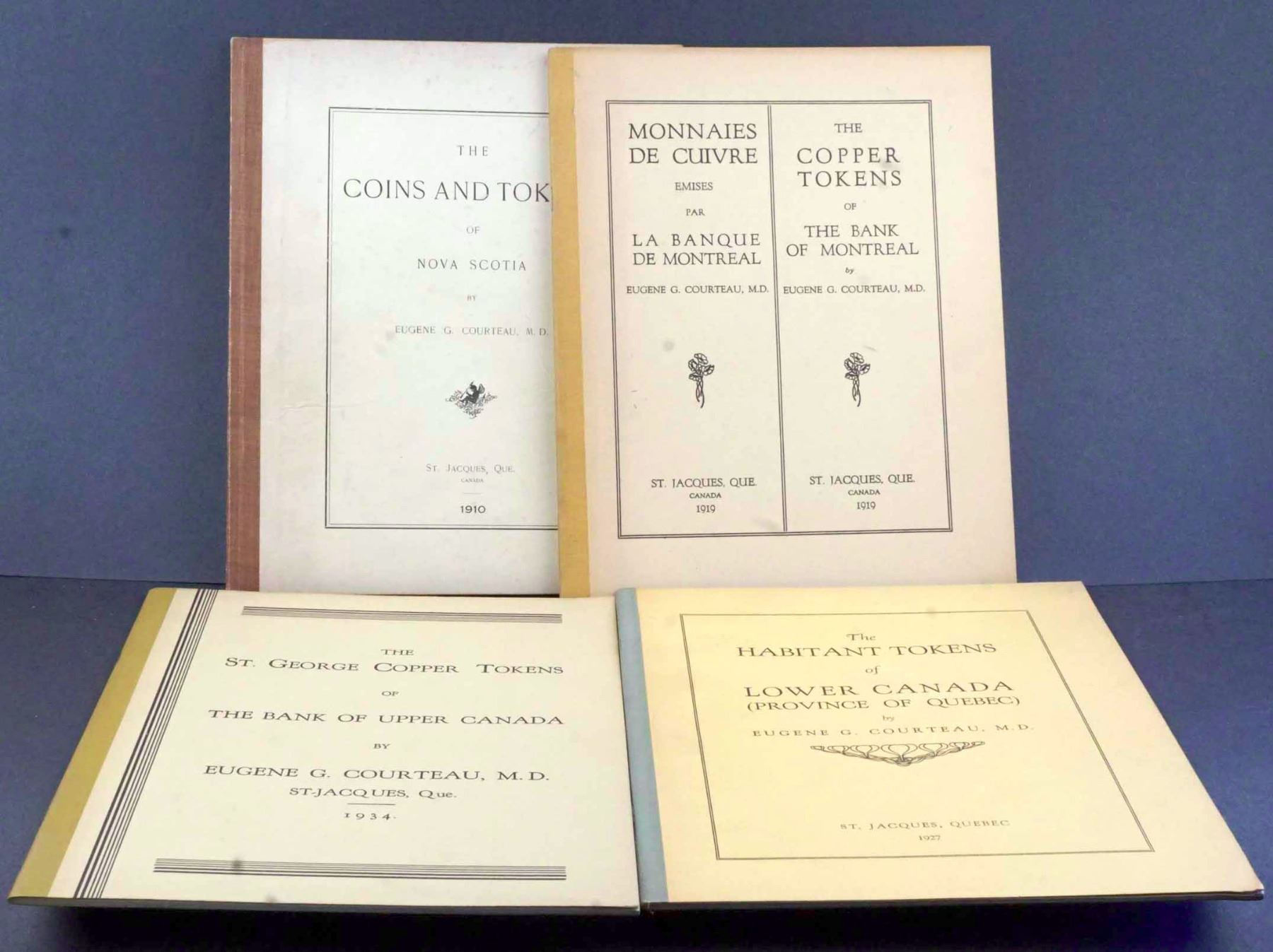 By Eugene G. Courteau, M. D. , 1910 - 1934. All self-published, at St. Jacques, Que. Identical measurements: 200 x 245 mm. Bound in boards, with differently coloured taped edges. 1) The COINS AND TOKENS of NOVA SCOTIA 1910. Seven Plates and 30 pages. Considerable internal annotation. 2) This one is bilingual. MONNAIES DE CUIVRE Emises par LA BANQUE DE MONTREAL - The COPPER TOKENS of THE BANK OF MONTREAL 1919. 25 pages, illustrations in the text, one page with two photos of the bank. Clean and solid, without any annotations. 3) The HABITANT TOKENS of LOWER CANADA (PROVINCE OF QUEBEC) 1927. Signed on top of the inside front cover : Hommage de l'auteur, Eug. G. Courteau. 24 pages, illustrations in the text. Clean, bright, like new. 4) The ST. GEORGE COPPER TOKENS of THE BANK OF UPPER CANADA 1934. 32 pages, with two illustrations in the text. One small faint pencil annotation on the back cover : 2525 underlined. Otherwise, clean and nice. One upper corner fold on the cover.