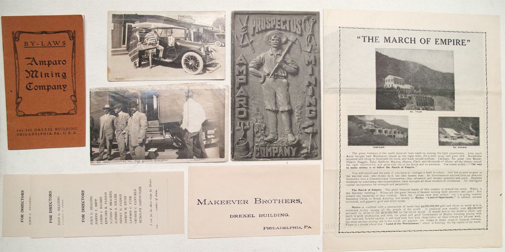 1) Facts and figures for investeros for the Ampara Mining Company. 2) Report on the El Mirador and El Favor mines. Post card of Americans in front of the Bazaar Mexicano. 4) Fold out photograph of Americans riding train in Mexico. Most are identified including Superinbendente del Ferrocarril de Sonora