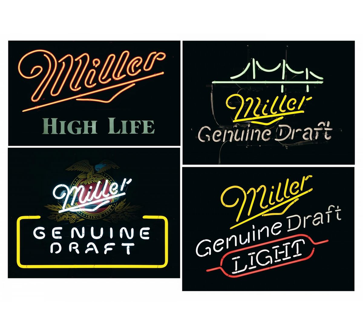 1) Miller High Life neon beer sign - All neon lights work. 26 1/4" wide x 17 1/4" tall with 5 1/2' cord. With Lowenbrau neon beer sign box. Rubber trim is coming off. 2) Miller Genuine Draft bridge neon beer sign - All neon lights appear to work but are dim. 22 3/4" wide x 15 1/2" tall with 8' cord. With unmarked box. 3) Miller Genuine Draft neon beer sign - All neon lights work. 26 1/2" wide x 20" tall with 7 1/2' cord. With Miller Genuine Draft neon sign box. 4) Miller Genuine Draft Light neon beer sign - All neon lights work. 30" wide x 24" tall with a 5 1/2' cord.