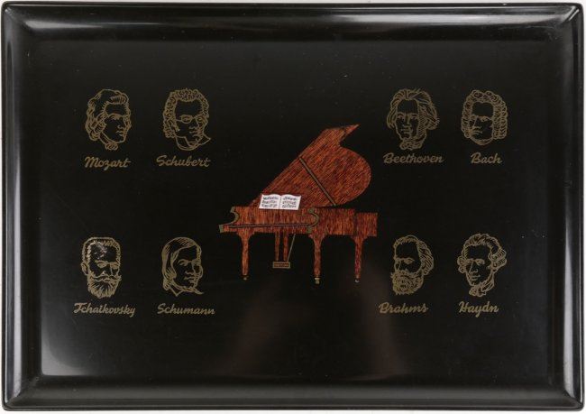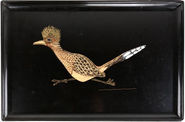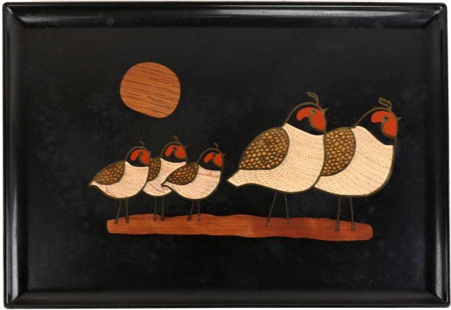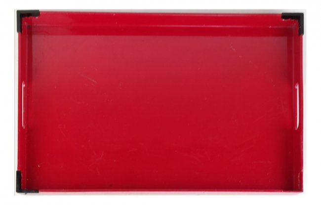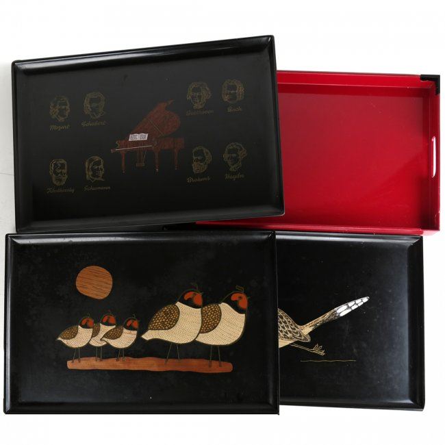 One red tray and three black decorated trays. [Red: 17 3/4" x 11" x 1 1/2"; Black: 18" x 12 1/2"]. Scratch and wear.