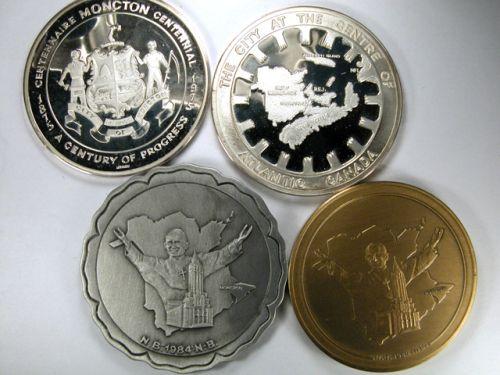 1875-1975 Moncton Centennial, two medals in Silver, 38.5mm. Plus 1984 Popes Visit to Moncton, two pieces, one silver-colour with Scalloped Edges, the other brass-colour, Round. Total four Moncton pieces